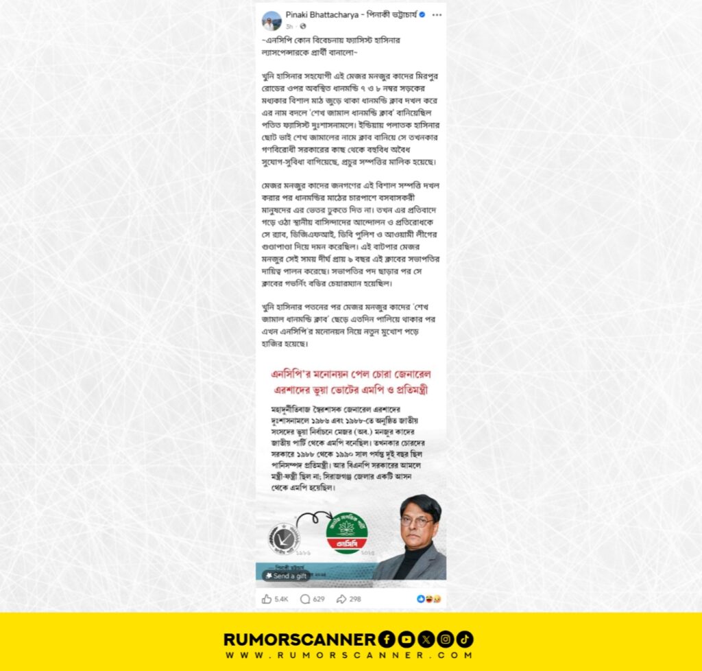আসন্ন ত্রয়োদশ জাতীয় সংসদ নির্বাচনকে সামনে রেখে গত ১০ ডিসেম্বর ১২৫টি আসনে মনোনীত প্রার্থীদের নাম ঘোষণা করে জাতীয় নাগরিক পার্টি বা এনসিপি। দলটির পক্ষ থেকে সিরাজগঞ্জ-৫ আসনে মনোনয়ন পায় সাবেক সংসদ সদস্য অবসরপ্রাপ্ত মেজর মনজুর কাদের। এনসিপির মনোনয়নপ্রাপ্ত মনজুর কাদের আওয়ামী লীগের শাসনামলে ধানমন্ডি ক্লাব দখল করে এর নাম পরিবর্তন করে ‘শেখ জামাল ধানমন্ডি ক্লাব’ করেন দাবি করে অনলাইন অ্যাক্টিভিস্ট পিনাকী ভট্টাচার্য একটি পোস্ট করেন। পিনাকী তার পোস্টে আরও দাবি করেন, এনসিপির মনোনীত মনজুর কাদের ক্লাব দখলের পাশাপাশি দীর্ঘ ৯ বছর ক্লাবটির সভাপতির দায়িত্ব পালন করেন। এসময় তিনি ক্লাবের গভনিং বডির চেয়ারম্যান হওয়ার সাথে সাথে ততকালীন আওয়ামী সরকার থেকে ব্যাপক সুযোগ-সুবিধা লাভ করে প্রচুর সম্পদের মালিক হন।