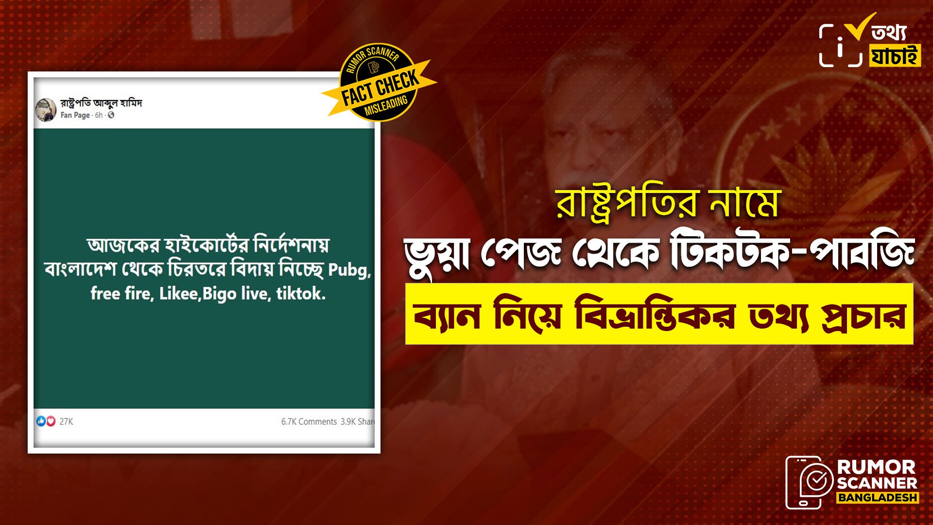 অর্থাৎ, মহামান্য রাষ্ট্রপতি আব্দুল হামিদ এর বরাতে প্রচারিত ‘বাংলাদেশ থেকে পাবজি, টিকটক সহ বাকি এপ্লিকেশন গুলোর চিরবিদায়’ সম্পর্কিত তথ্যটি সম্পূর্ণ বানোয়াট ও বিভ্রান্তিকর।