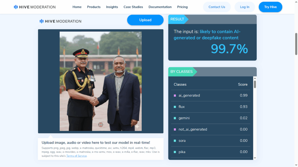 এ বিষয়ে অধিকতর নিশ্চিত হতে এআই কনটেন্ট শনাক্তকারী প্ল্যাটফর্ম ‘হাইভ মডারেশন’ এ আলোচিত ছবিটি বিশ্লেষণ করলে এটি এআই দিয়ে তৈরি কনটেন্ট হওয়ার সম্ভাবনা ৯৯.৭ শতাংশ দেখা যায়। এছাড়াও এআই ও ডিপফেক কনটেন্ট শনাক্তকারী আরেক প্ল্যাটফর্ম ‘ডিপফেক ও মিটার’ এ আলোচিত ছবিটি বিশ্লেষণ করলে এটি ভুয়া হওয়ার সম্ভাবনা বেশি দেখা যায়। প্ল্যাটফর্মটির ‘SIA’ ডিটেক্টরের বিশ্লেষণমতে ছবিটি ভুয়া হওয়ার সম্ভাবনা ৮৬.৩ শতাংশ।