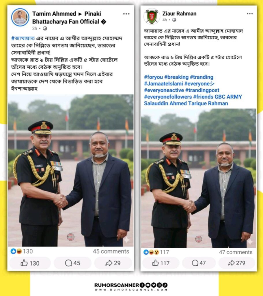সম্প্রতি সামাজিক যোগাযোগ মাধ্যমে ভারতের সেনাপ্রধান উপেন্দ্র দ্বিবেদীর সাথে জামায়াতে ইসলামীর নায়েবে আমির ডা. সৈয়দ আবদুল্লাহ মোহাম্মদ তাহেরের ছবি দাবিতে একটি ছবি প্রচার করা হচ্ছে। ছবিটি প্রচার করে ক্যাপশনে দাবি করা হয়েছে, ‘জামায়াত এর নায়েব এ আমীর আব্দুল্লাহ মোহাম্মদ তাহের কে দিল্লিতে স্বাগতম জানিয়েছে, ভারতের সেনাবাহিনী প্রধান! আজকে রাত ৯ টায় দিল্লির একটি ৫ স্টার হোটেলে তাঁদের মধ্যে বেঠক অনুষ্ঠিত হবে।’