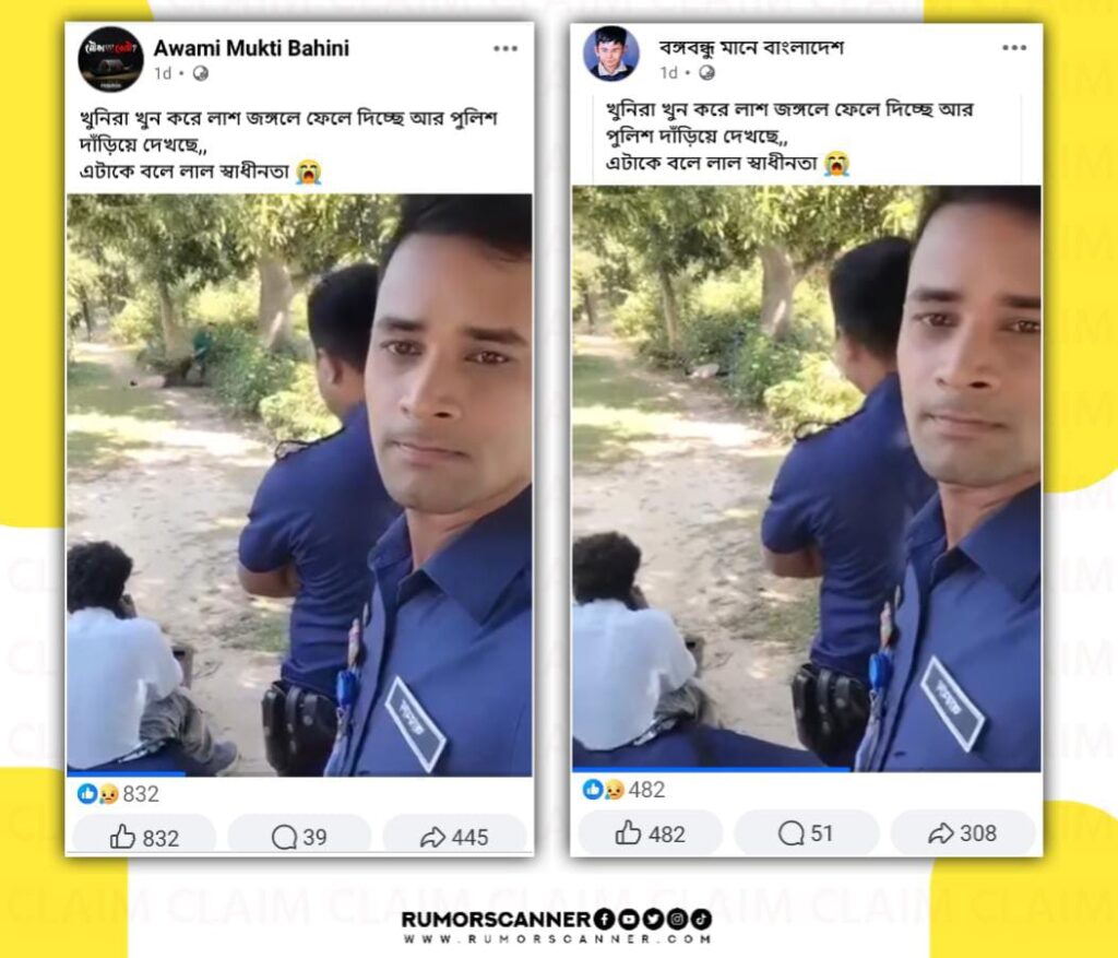 সম্প্রতি সামাজিক যোগাযোগ মাধ্যমে একটি ভিডিও প্রচার করা হয়েছে যেখানে দেখা যাচ্ছে একজন নিথর ব্যক্তিকে আরেকজন ব্যক্তি টেনে নিয়ে যাচ্ছেন এবং তা পুলিশের পোশাক পরা অবস্থায় কয়েকজন দাঁড়িয়ে দেখছেন ও ভিডিও করছেন। ভিডিওটি প্রচার করে দাবি করা হয়েছে, ‘খুনিরা খুন করে লাশ জঙ্গলে ফেলে দিচ্ছে আর পুলিশ দাঁড়িয়ে দেখছে’।