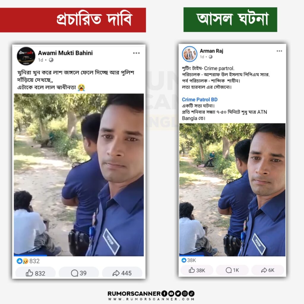 সুতরাং, ‘ক্রাইম পেট্রোল বিডি’ নামের একটি নাটক সিরিজের অভিনয়ের দৃশ্যকে পুলিশের সামনে খুন করে জঙ্গলে টেনে নেওয়ার আসল ভিডিও দাবিতে প্রচার করা হয়েছে; যা মিথ্যা।