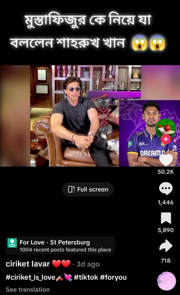 ভারতীয় ক্রিকেট বোর্ডের (বিসিসিআই) নির্দেশে বাংলাদেশের পেসার মুস্তাফিজুর রহমানকে স্কোয়াড থেকে বাদ দিয়েছে আইপিএলের ফ্র্যাঞ্চাইজি দল কলকাতা নাইট রাইডার্স (কেকেআর)। অন্যদিকে, বলিউড তারকা শাহরুখ খান তার দল কেকেআরে খেলার জন্য মুস্তাফিজকে কিনে তীব্র সমালোচনার মুখে পড়েছেন। তাকে ‘গাদ্দার’ বা দেশদ্রোহী আখ্যা দিয়েছেন ভারতের উত্তরপ্রদেশের বিজেপির কট্টরপন্থী নেতা সঙ্গীত সোম। এসব ঘটনার প্রেক্ষিতে সম্প্রতি ‘মুস্তাফিজুর কে নিয়ে যা বললেন শাহরুখ খান’ শিরোনামে একটি ভিডিও টিকটকে প্রচার করা হয়েছে।