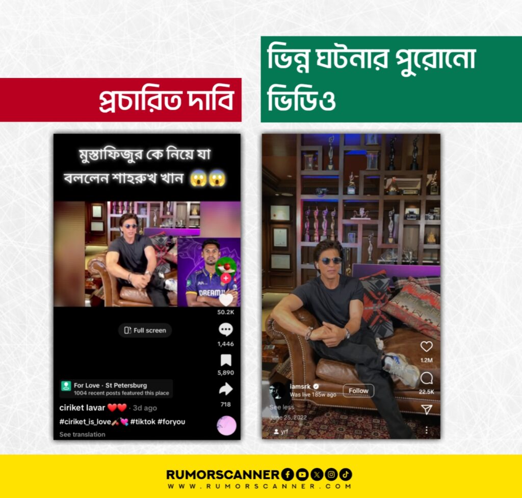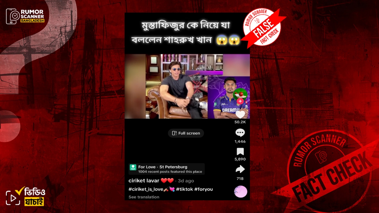 রিউমর স্ক্যানার টিমের অনুসন্ধানে জানা যায়, প্রচারিত ভিডিওটি ক্রিকেটার মুস্তাফিজুর রহমান ইস্যুতে শাহরুখ খানের বক্তব্যের নয় এবং এই ইস্যুতে শাহরুখ খান এরূপ কোনো বক্তব্য প্রদান করেননি। প্রকৃতপক্ষে, ২০২২ সালে শাহরুখ খানের একটি আসন্ন সিনেমার প্রচারণা ও বলিউডে তার ৩০ বছর পূর্তি উপলক্ষ্যে করা একটি লাইভ সেশনের ভিডিওকে উক্ত দাবিতে প্রচার করা হয়েছে।