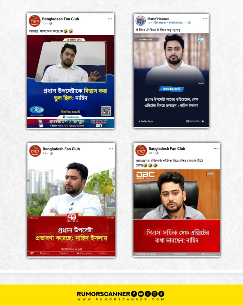 সম্প্রতি ‘প্রধান উপদেষ্টাকে বিশ্বাস করা ভুল ছিল: নাহিদ’ শিরোনামে ইলেকট্রনিক গণমাধ্যম আরটিভি, ‘প্রধান উপদেষ্টা আখের গুছিয়েছেন, সেফ এক্সিটের বিষয়ে ভাবছেন: নাহিদ ইসলাম’ শিরোনামে কালের কন্ঠ এবং ‘প্রধান উপদেষ্টা প্রতারণা করেছে: নাহিদ ইসলাম’ শিরোনামে একাত্তর টিভির ডিজাইন সংবলিত তিনটি পৃথক ফটোকার্ড সামাজিক যোগাযোগ মাধ্যমে প্রচার করা হয়েছে।