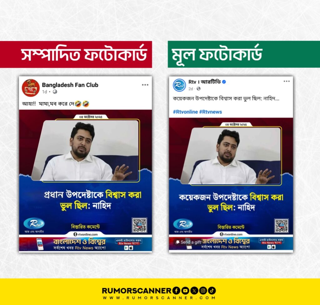 অর্থাৎ, আরটিভির লোগো ও ডিজাইন সংবলিত ফটোকার্ড সম্পাদনা করে নাহিদ ইসলামের মন্তব্য বিকৃতভাবে প্রচার করা হয়েছে।