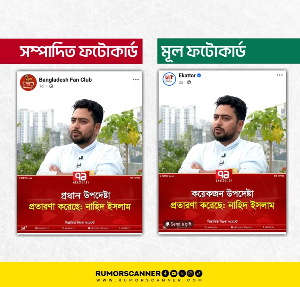 অর্থাৎ, একাত্তর টিভির লোগো ও ডিজাইন সংবলিত ফটোকার্ড সম্পাদনা করে নাহিদ ইসলামের মন্তব্য বিকৃতভাবে প্রচার করা হয়েছে।