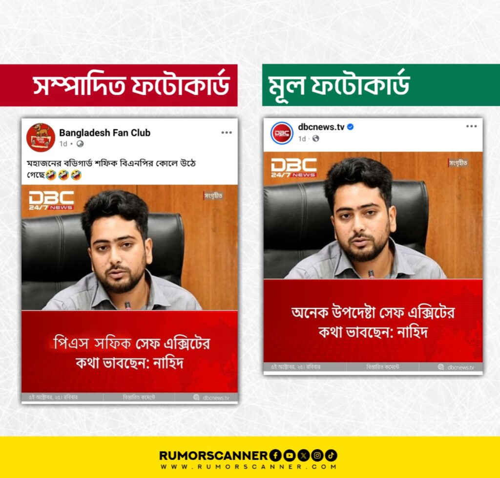 এছাড়া, ‘পিএস সফিক সেফ এক্সিটের কথা ভাবছেন: নাহিদ’ শিরোনামে ডিবিসি নিউজের ডিজাইন সংবলিত একটি ফটোকার্ডও সামাজিক যোগাযোগ মাধ্যমে প্রচার করা হয়েছে।