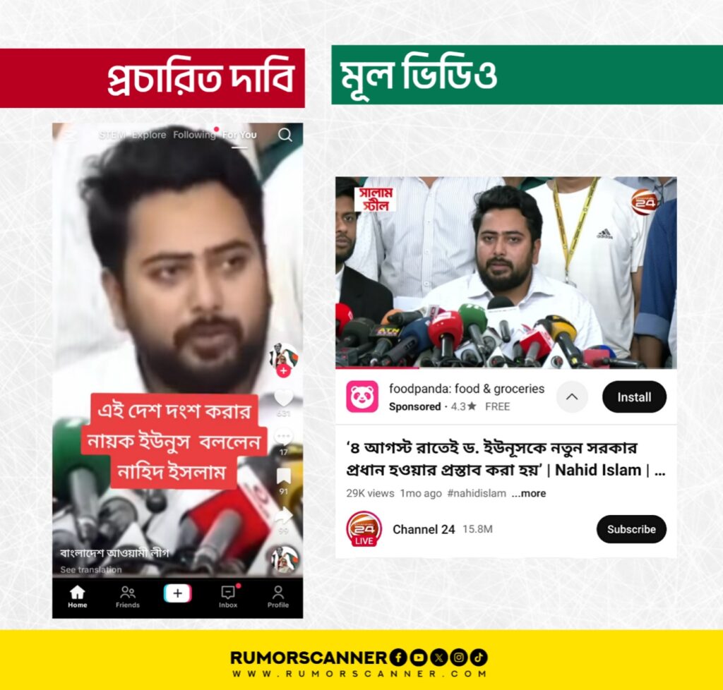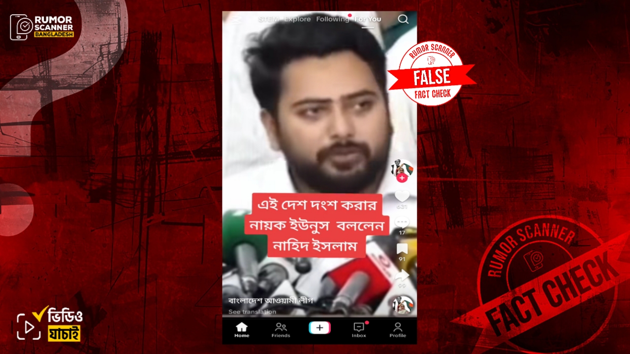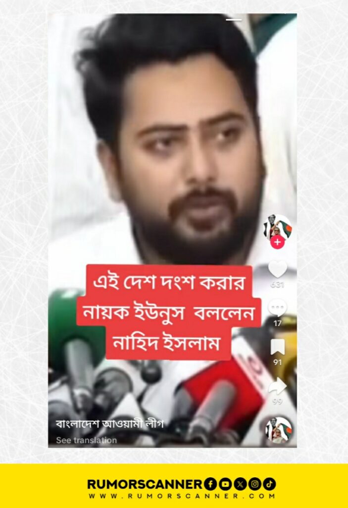 সম্প্রতি সামাজিক যোগাযোগ মাধ্যমে ‘বাংলাদেশ আওয়ামী লীগ’ নামের একটি টিকটক অ্যাকাউন্ট থেকে জাতীয় নাগরিক পার্টির (এনসিপি) আহ্বায়ক নাহিদ ইসলাম বক্তব্য দিচ্ছেন এমন একটি ভিডিও প্রচার করা হয়েছে। ভিডিওটির ক্যাপশনে লেখা ছিল “এই দেশ ধ্বংস করার নায়ক ইউনূস। বললেন, নাহিদ ইসলাম।”