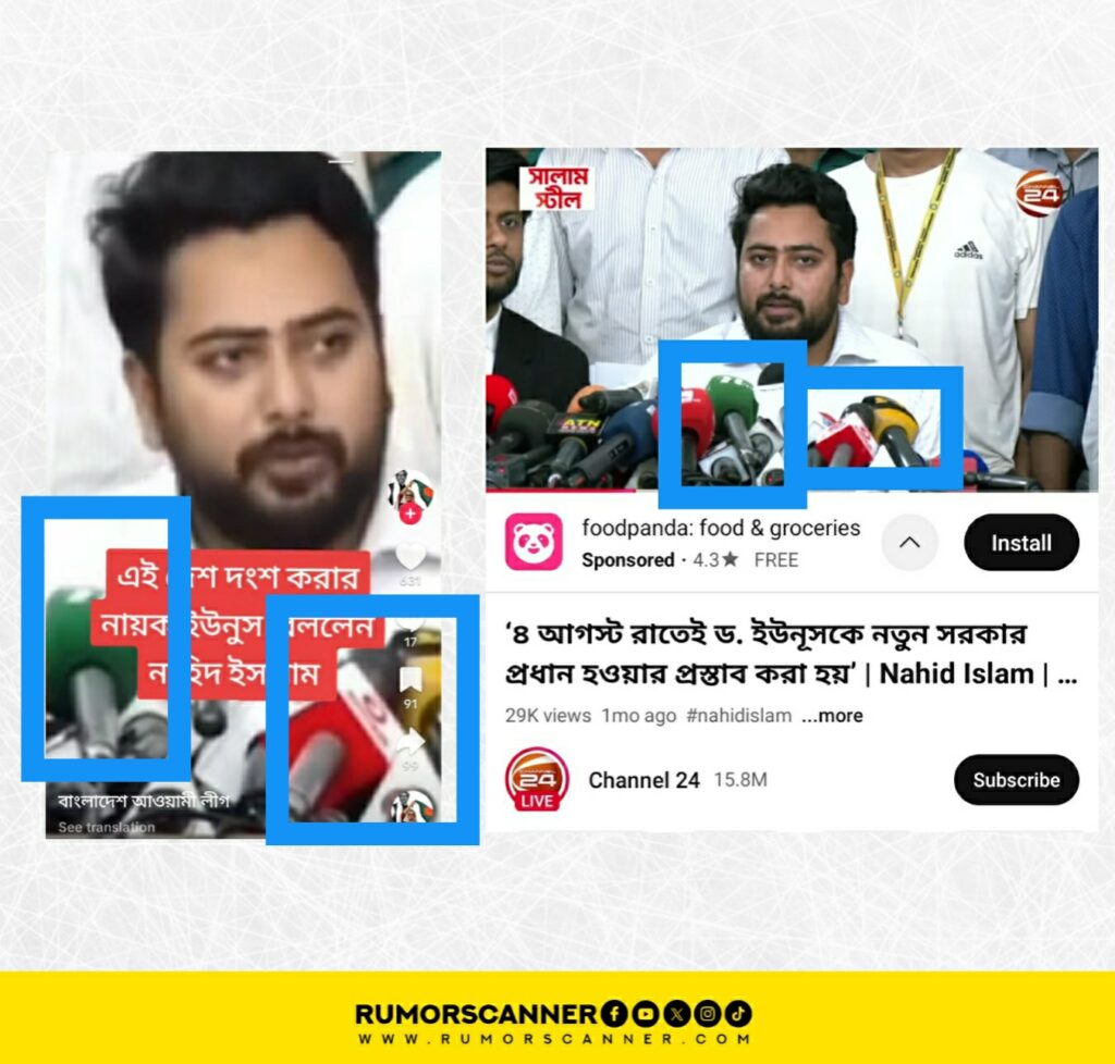 এ বিষয়ে অনুসন্ধানে, মূলধারার গণমাধ্যম চ্যানেল২৪ এর ইউটিউব চ্যানেলে ১৮ সেপ্টেম্বর প্রকাশিত একটি ভিডিও পাওয়া যায়। উক্ত ভিডিওটির সাথে আলোচিত দাবিতে প্রচারিত ভিডিওর সাদৃশ্য রয়েছে। ভিডিওতে থাকা নাহিদ ইসলামের পোশাকের রং, তার ব্যাকগ্রাউন্ডে থাকা সাদা টি-শার্ট পরিহিত ব্যক্তি, তার সামনে রাখা সংবাদ মাধ্যমের লোগোযুক্ত মাইক্রোফোনের অবস্থানে মিল রয়েছে।