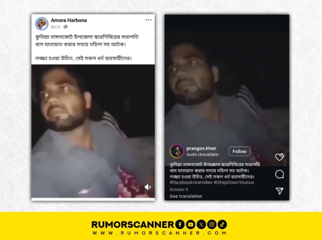 সম্প্রতি ‘কুমিল্লা নাঙ্গলকোট উপজেলা ছাত্রশিবিরের সভাপতি বাস যাতায়াত করার সময়ে মহিলা সহ আটক।’ ক্যাপশনে একটি ভিডিও ইন্টারনেটে বিভিন্ন প্লাটফর্মে প্রচার করা হয়েছে৷