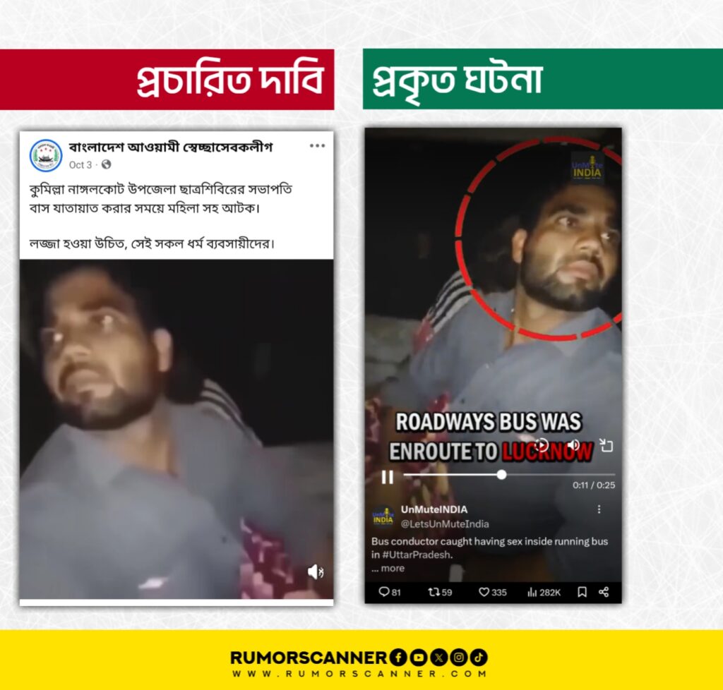 রিউমর স্ক্যানার টিমের অনুসন্ধানে জানা যায়, প্রচারিত ভিডিওর ঘটনাটি বাংলাদেশে ঘটেনি এবং ভিডিওতে থাকা পুরুষটি বাংলাদেশ ইসলামী ছাত্রশিবির নাঙ্গলকোট উপজেলার সভাপতিও নন৷ প্রকৃতপক্ষে, ভারতের উত্তরপ্রদেশের গোবিন্দ সিং নামের একজন বাস কন্ডাক্টরের পুরোনো ভিডিওকে উক্ত দাবিতে প্রচার করা হয়েছে।