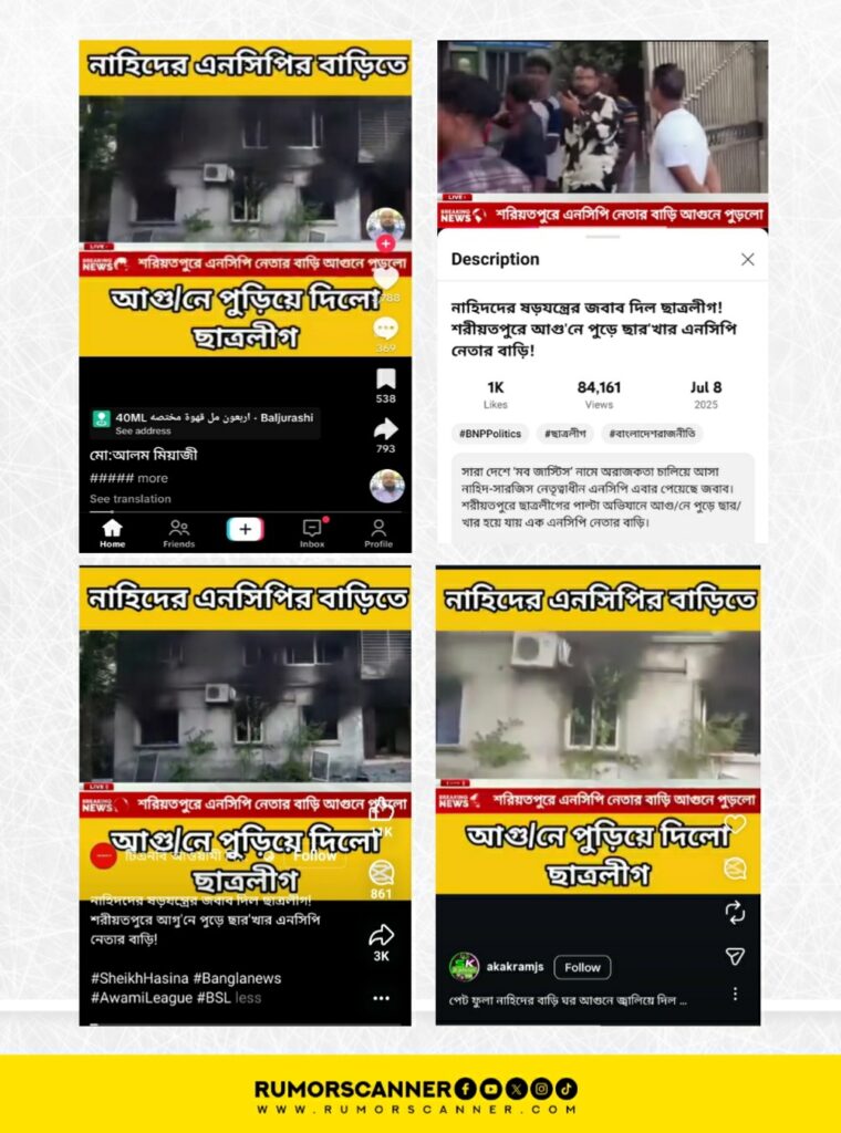 সম্প্রতি সামাজিক যোগাযোগ মাধ্যমে একটি ভিডিও প্রচার করে দাবি করা হয়েছে, শরীয়তপুরে নাহিদ ইসলামের জাতীয় নাগরিক পার্টির (এনসিপি) এক নেতার বাড়িতে আগুন দিয়েছে নিষিদ্ধ ঘোষিত বাংলাদেশ ছাত্রলীগের নেতা-কর্মীরা।