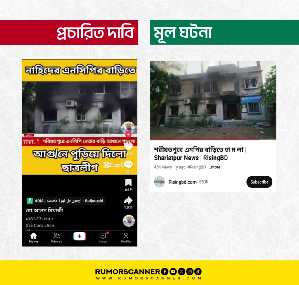 আ.লীগ নেতার বাড়িতে অগ্নিসংযোগের পুরোনো ভিডিওকে এনসিপি নেতার বাড়িতে আগুন দাবিতে প্রচার