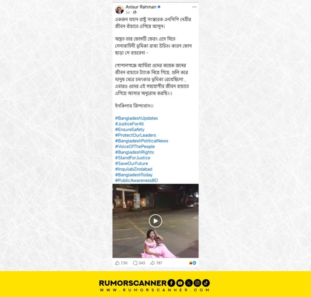 রিউমর স্ক্যানার টিমের অনুসন্ধানে জানা যায়, উক্ত ভিডিওটি কোনো এনসিপি নেত্রীর নয়। প্রকৃতপক্ষে, গুলশানে পুলিশ চেকপোস্টে এক নারীকে তল্লাশি করার সময়ের ভিডিওকে উক্ত দাবিতে প্রচার করা হয়েছে।