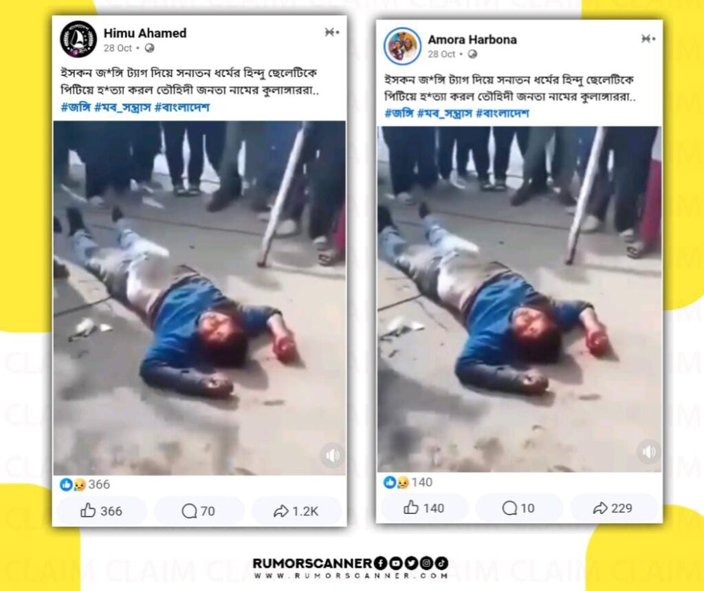 সম্প্রতি সামাজিক যোগাযোগ মাধ্যমে একজন ব্যক্তিকে মারার একটি ভিডিও প্রচার করে ক্যাপশনে লেখা হয়েছে, ‘ইসকন জঙ্গি ট্যাগ দিয়ে সনাতন ধর্মের হিন্দু ছেলেটিকে পিটিয়ে হত্যা করল তৌহিদী জনতা নামের কুলাঙ্গাররা.. #জঙ্গি #মব_সন্ত্রাস #বাংলাদেশ’।