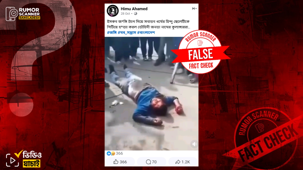 রিউমর স্ক্যানার টিমের অনুসন্ধানে জানা যায়, প্রচারিত ভিডিওটি ‘ইসকন জঙ্গি’ ট্যাগ দিয়ে বাংলাদেশে হিন্দু ধর্মাবলম্বী ছেলেকে তৌহিদি জনতার পিটিয়ে হত্যা করার দৃশ্যের নয়। প্রকৃতপক্ষে, ভিডিওটি নেপালের।