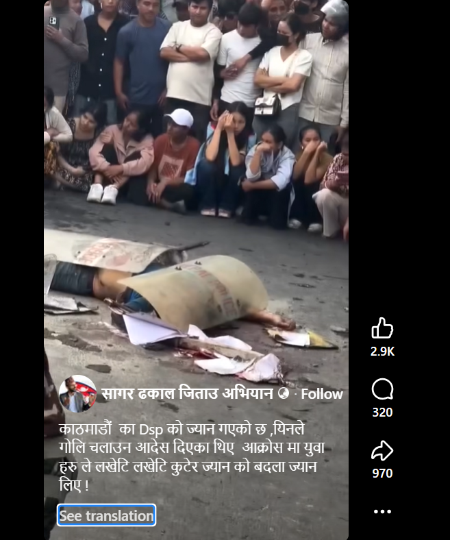 একই ঘটনার আরো একটি ভিডিও নেপালের একটি ফেসবুক অ্যাকাউন্টে খুঁজে পাওয়া যায়। এই ভিডিওর ক্যাপশনে দাবি করা হয়, কাঠমান্ডুর একজন ডিএসপি মারা গেছেন। তিনিই আন্দোলনে গুলি করার নির্দেশ দিয়েছিলেন। আন্দোলনকারী যুবকরা ক্ষুদ্ধ হয়ে তাকে ধাওয়া করে মারধর করে। পরবর্তীতে তার মৃত্যু নিশ্চিতের মাধ্যমে তারা প্রতিশোধ নেয়।
