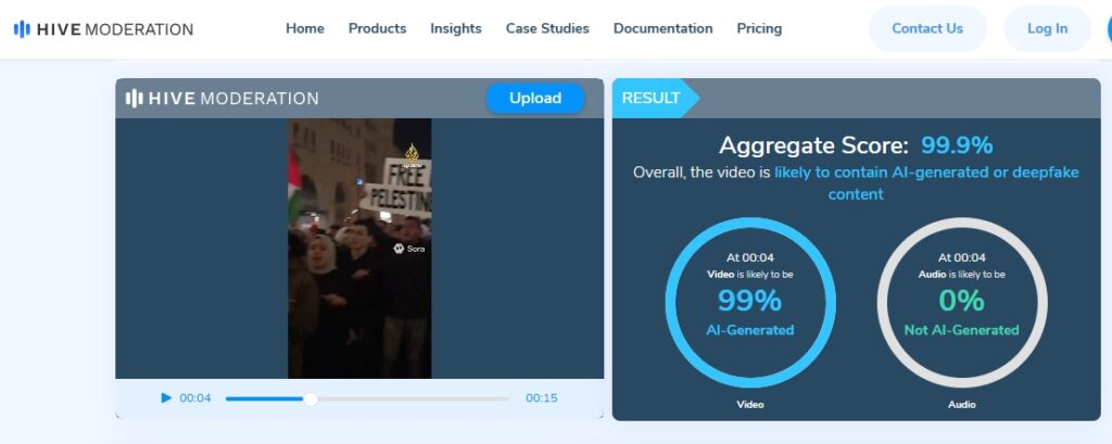 বিষয়টি আরও নিশ্চিত করতে ভিডিওটি এআই-ভিত্তিক কনটেন্ট শনাক্তকারী ওয়েবসাইট হাইভ মোডারেশনে বিশ্লেষণ করা হয়। ফলাফলে দেখা যায়, ভিডিওটি এআই প্রযুক্তি ব্যবহার করে তৈরি হওয়ার সম্ভাবনা ৯৯ শতাংশ।