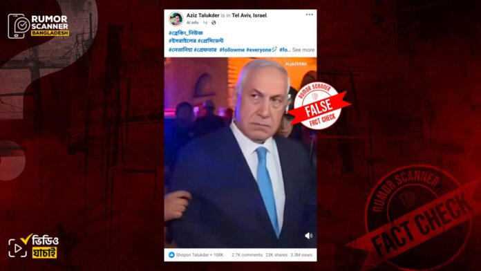 ইসরায়েলের প্রধানমন্ত্রী বেনিয়ামিন নেতানিয়াহু গ্রেফতার হয়েছেন দাবিতে সম্প্রতি একটি ভিডিও একাধিক সামাজিক যোগাযোগ মাধ্যমে ছড়িয়ে পড়েছে। ভিডিওটি কাতারভিত্তিক সংবাদমাধ্যম আল জাজিরার প্রতিবেদন বলে প্রচার করা হচ্ছে। এতে নেতানিয়াহুকে হাতকড়া পরা অবস্থায় দেখা যায় এবং আশপাশ থেকে ‘ফ্রি প্যালেস্টাইন’ স্লোগান শোনা যায়। ভিডিওটির কথিত সংবাদ পাঠ অংশে ইংরেজিতে বলা হয়েছে, “ইসরায়েলের প্রধানমন্ত্রী ও লিকুদ পার্টির নেতা ইয়ারন বেনডারেলকে দুর্নীতির একাধিক অভিযোগে রাজধানী থেকে গ্রেফতার করা হয়েছে। আজ রাতে তাকে হেফাজতে নেওয়া হয়েছে এবং সকালে বিচারকের সামনে তোলা হবে। ঘটনাস্থলে মানুষের ভিড় জমেছে…”