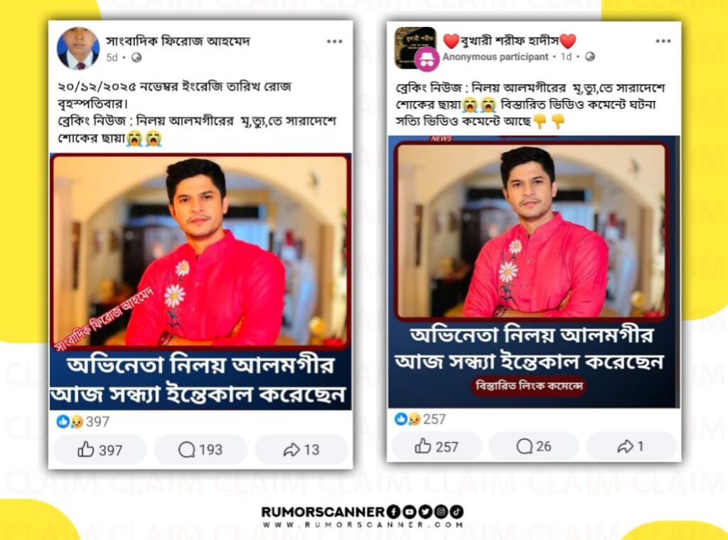 সুতরাং, অভিনেতা নিলয় আলমগীরের মৃত্যুর দাবিটি মিথ্যা।