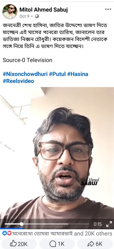 গত ০৯ অক্টোবর থেকে সাবেক সংসদ সদস্য ও যুবলীগের প্রেসিডিয়াম সদস্য মুজিবুর রহমান ওরফে নিক্সনের কথিত একটি ভিডিও বার্তা সামাজিক যোগাযোগ মাধ্যমে প্রচার করা হচ্ছে। ভিডিওতে নিক্সনের কণ্ঠে বলতে শোনা যায়, “শোনেন আমার ফুফু আগামী ডিসেম্বরের ৭ তারিখে দেশে যাচ্ছেন আপনারা ইতোমধ্যেই সবাই তা জানতে পেরেছেন। এই মাসের ১৫ তারিখে আমার ফুফু জাতির উদ্দেশ্যে ভাষণ দিতে যাচ্ছেন। মনে রাখবেন এই মাসের ১৫ তারিখ। ভিডিওটা সবার কাছে ছড়িয়ে দিন। কিছু বিদেশি নেতার সাথে সাথে জাতির উদ্দেশ্যে ভাষণ দেবেন।”