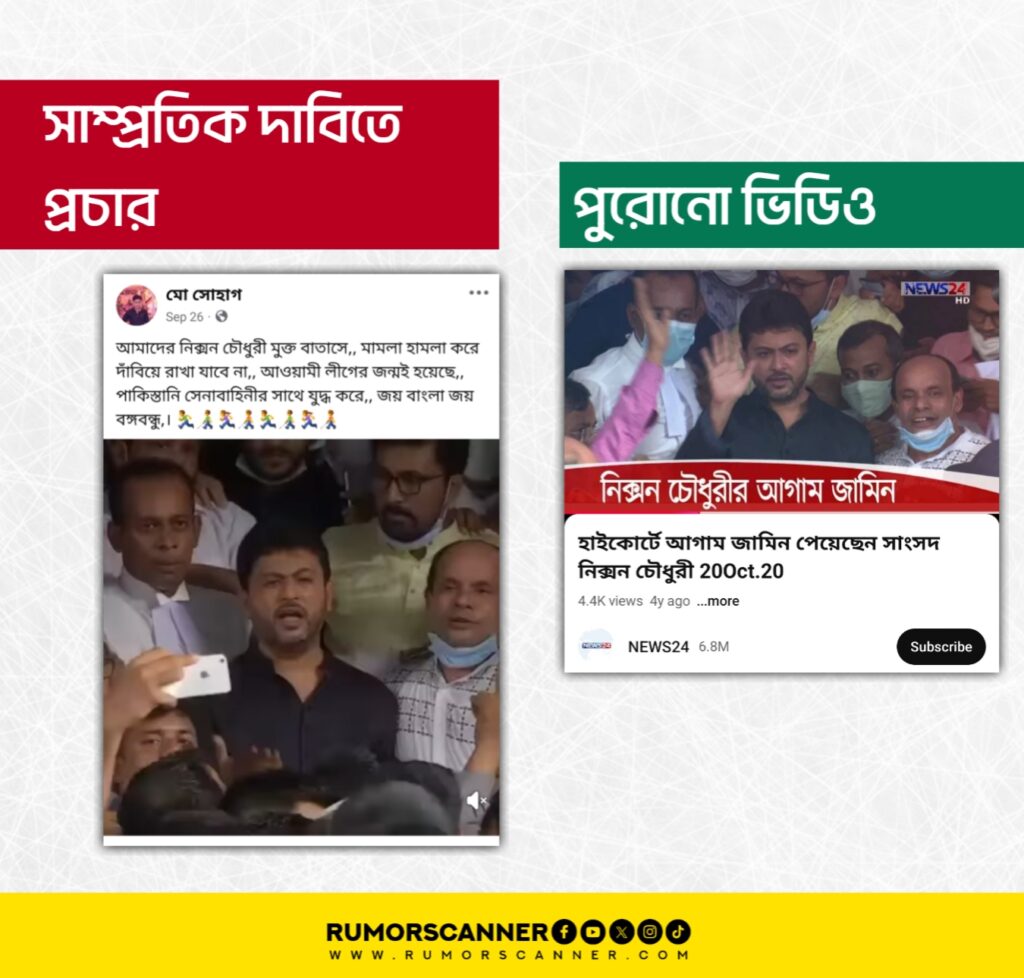 উক্ত ভিডিওর সূত্র ধরে মূল ধারার গণমাধ্যম NEWS24 এর ইউটিউব চ্যানেলে একই তারিখে ‘হাইকোর্টে আগাম জামিন পেয়েছেন সাংসদ নিক্সন চৌধুরী 200ct.20’ শিরোনামে প্রকাশিত একটি ভিডিও প্রতিবেদন খুঁজে পাওয়া যায়। উক্ত ভিডিও প্রতিবেদনের একটি অংশের সাথে আলোচিত ভিডিওটির মিল লক্ষ্য করা যায়।