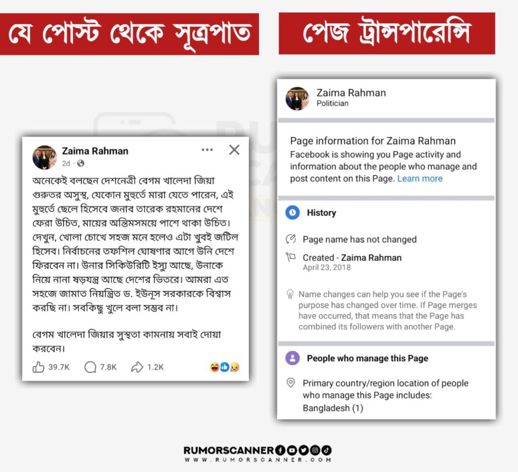 উপরোল্লিখিত পোস্ট থেকে আলোচিত দাবির সূত্রপাত। পেজটির ট্রান্সপারেন্সি অংশ পর্যবেক্ষণ করলে দেখা যায়, পেজটি জাইমা রহমানের নামে ২০১৮ সালের ২৩ এপ্রিলে তৈরি করা হয়েছে এবং পেজটি বাংলাদেশ থেকে পরিচালিত হয়ে থাকে৷ অপরদিকে জাইমা রহমান মূলত যুক্তরাজ্যে অবস্থান করেন।