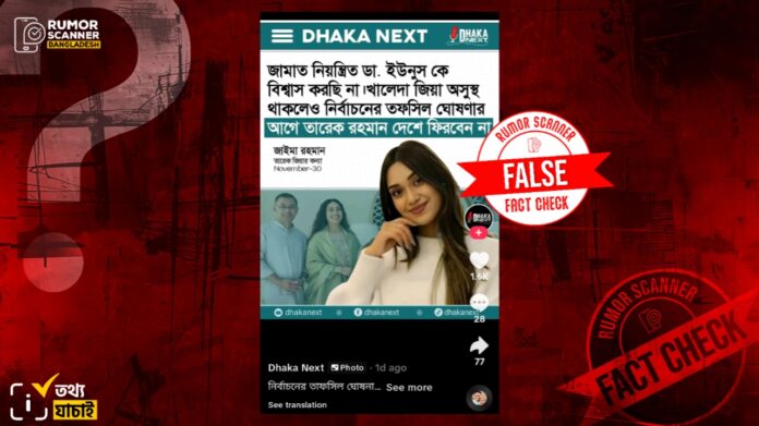 সম্প্রতি অনলাইনে দাবি প্রচার করা হয়েছে, বিএনপির ভারপ্রাপ্ত চেয়ারম্যান তারেক রহমানের মেয়ে ব্যারিস্টার জাইমা রহমান বলেছেন, ‘জামাত নিয়ন্ত্রিত ডা. ইউনুস কে বিশ্বাস করছি না। খালেদা জিয়া অসুস্থ থাকলেও নির্বাচনের তফসিল ঘোষণার আগে তারেক রহমান দেশে ফিরবেন না।’
