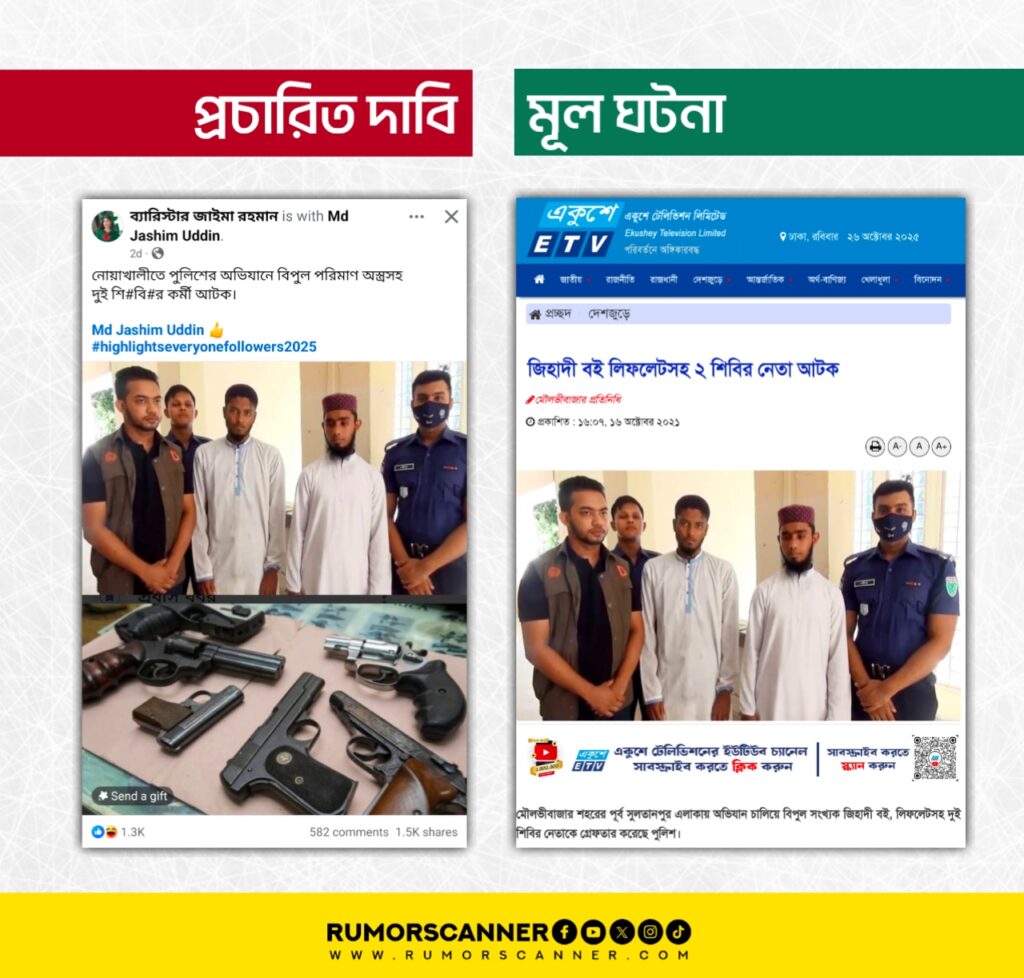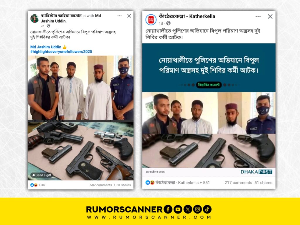 সম্প্রতি, নোয়াখালীতে পুলিশের অভিযানে বিপুল পরিমাণ অস্ত্রসহ দুইজন শিবির কর্মী আটক হয়েছে দাবিতে সামাজিক যোগাযোগ মাধ্যম ফেসবুকে একটি ছবি প্রচার করা হয়েছে।