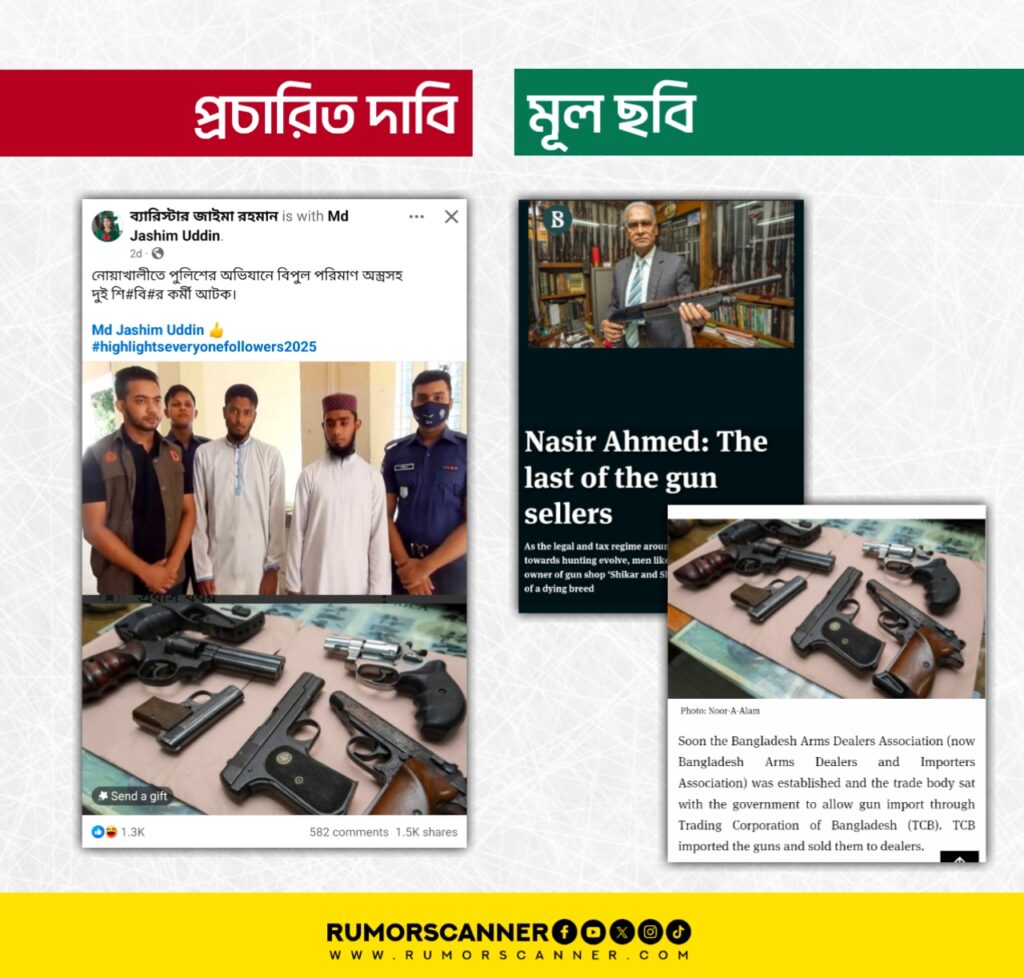 পরবর্তীতে আলোচিত দাবিতে প্রচারিত ছবিগুলোর সাথে যুক্ত আগ্নেয়াস্ত্রের ছবিটির বিষয়ে অনুসন্ধানে দেখা যায়, ছবিটি ২০২২ সালে দ্য বিজনেস স্ট্যান্ডার্ডে দেশের ‘সর্বশেষ’ বন্দুক ব্যবসায়ী নাসির আহমেদকে নিয়ে প্রকাশিত একটি প্রতিবেদন থেকে নেওয়া হয়েছে।
