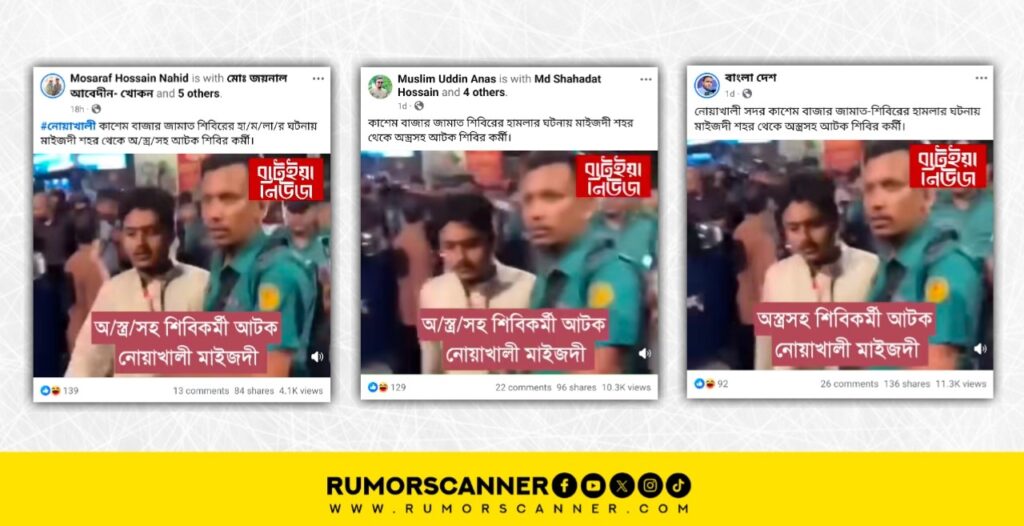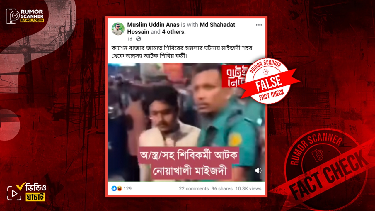 গত ১৯ অক্টোবর নোয়াখালী সদর উপজেলার নেয়াজপুর ইউনিয়নের কাশেমবাজারে জামে মসজিদে ছাত্রশিবিরের কর্মীরা কোরআন শিক্ষা কর্মসূচিকে ঘিরে ইসলামী ছাত্রশিবির ও যুবদলের নেতা-কর্মীদের মধ্যে সংঘর্ষের ঘটনা ঘটে। এ ঘটনায় মসজিদের ব্যাপক ক্ষয়ক্ষতির পাশাপাশি উভয় পক্ষের বেশ কয়েকজন আহত হয়। এর প্রেক্ষিতে সম্প্রতি, উক্ত হামলার ঘটনায় নোয়াখালীর মাইজদী নামক এলাকা থেকে অস্ত্রসহ একজন শিবির কর্মীকে আটক করা হয়েছে দাবিতে সামাজিক যোগাযোগ মাধ্যমে একটি ভিডিও প্রচার করা হয়েছে। ভিডিওতে দেখা যায়, একজন পুলিশ সদস্য গলায় আইডি কার্ড ঝুলানো পাঞ্জাবি পরিহিত এক ব্যক্তিকে ধরে নিয়ে যাচ্ছেন।