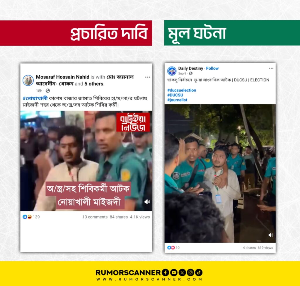রিউমর স্ক্যানার টিমের অনুসন্ধানে দেখা যায়, আলোচিত ভিডিওটি নোয়াখালীতে সাম্প্রতিক সময়ে হওয়া শিবির-যুবদল সংঘর্ষের ঘটনায় কোনো শিবির কর্মীকে আটকের ঘটনার নয়। প্রকৃতপক্ষে, ডাকসু নির্বাচনের দিন ঢাকা বিশ্ববিদ্যালয় এলাকা থেকে ভুয়া সাংবাদিককে আটকের মুহূর্তের ভিডিওকে আলোচিত দাবিতে প্রচার করা হয়েছে।