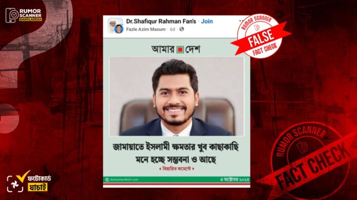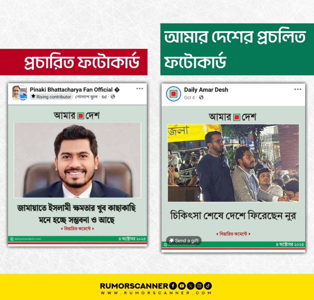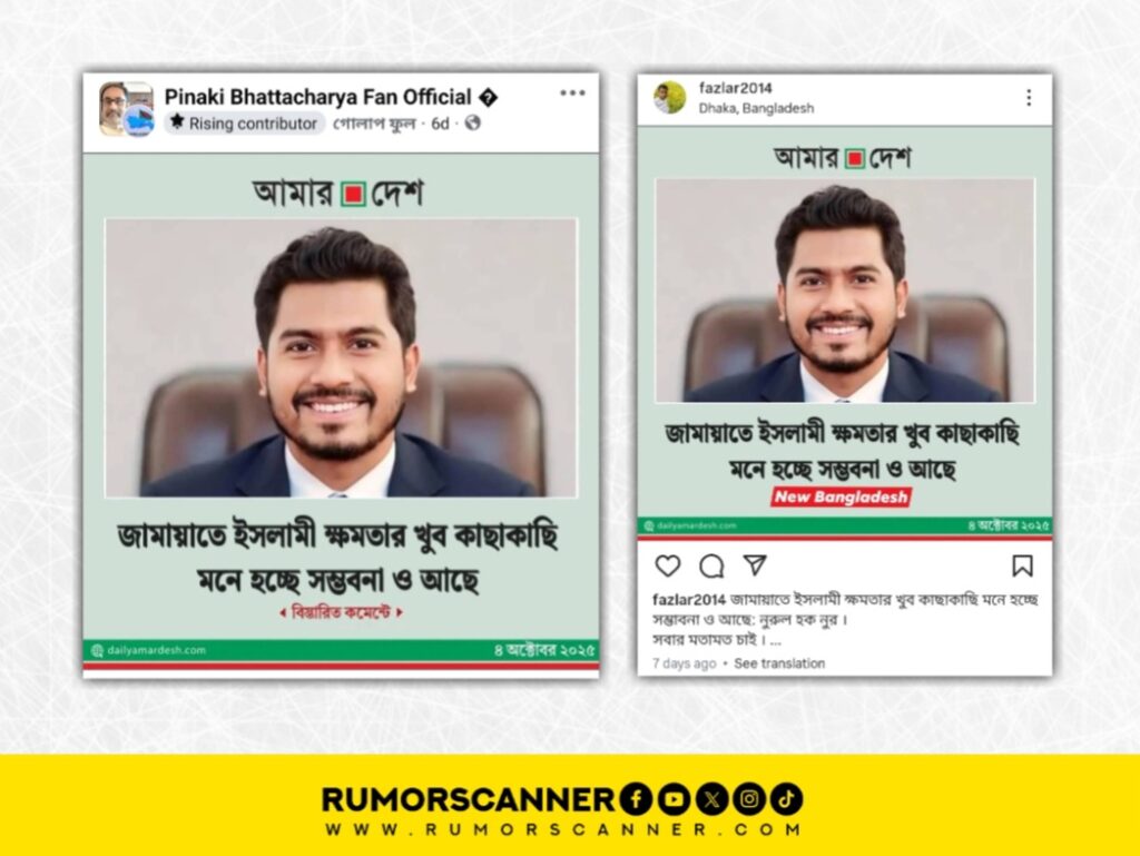 রিউমর স্ক্যানার টিমের অনুসন্ধানে জানা যায়, ‘জামায়াতে ইসলামী ক্ষমতার খুব কাছাকাছি মনে হচ্ছে সম্ভবনা ও আছে’ শিরোনামে নুরুল হক নুরের ছবি যুক্ত করে আমার দেশ কোনো ফটোকার্ড বা সংবাদ প্রকাশ করেনি এবং নুরুল হক নুরও এমন কোনো মন্তব্য করেননি। প্রকৃতপক্ষে, আমার দেশের প্রচলিত ফটোকার্ডের আদলে ডিজিটাল প্রযুক্তির সহায়তা আলোচিত ফটোকার্ডটি তৈরি করা হয়েছে।