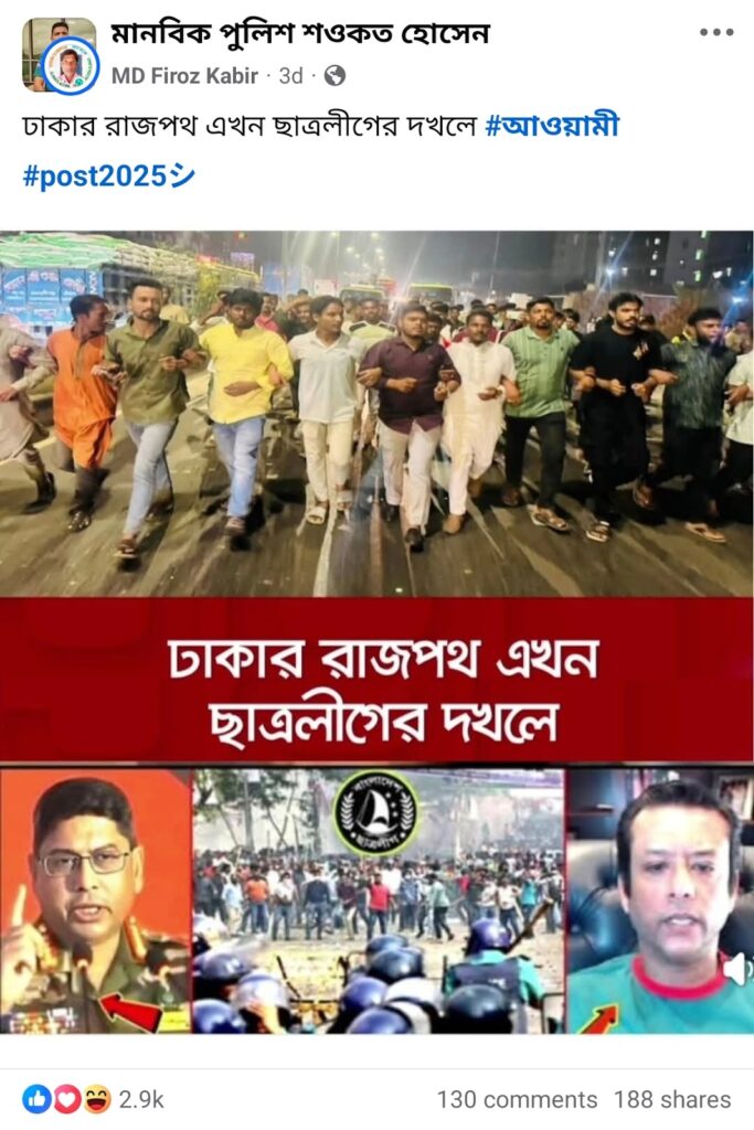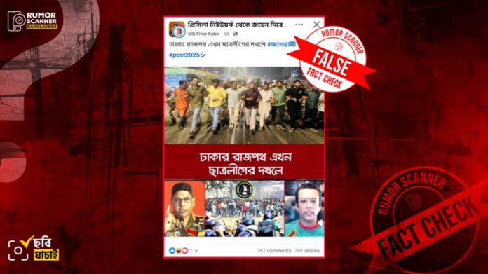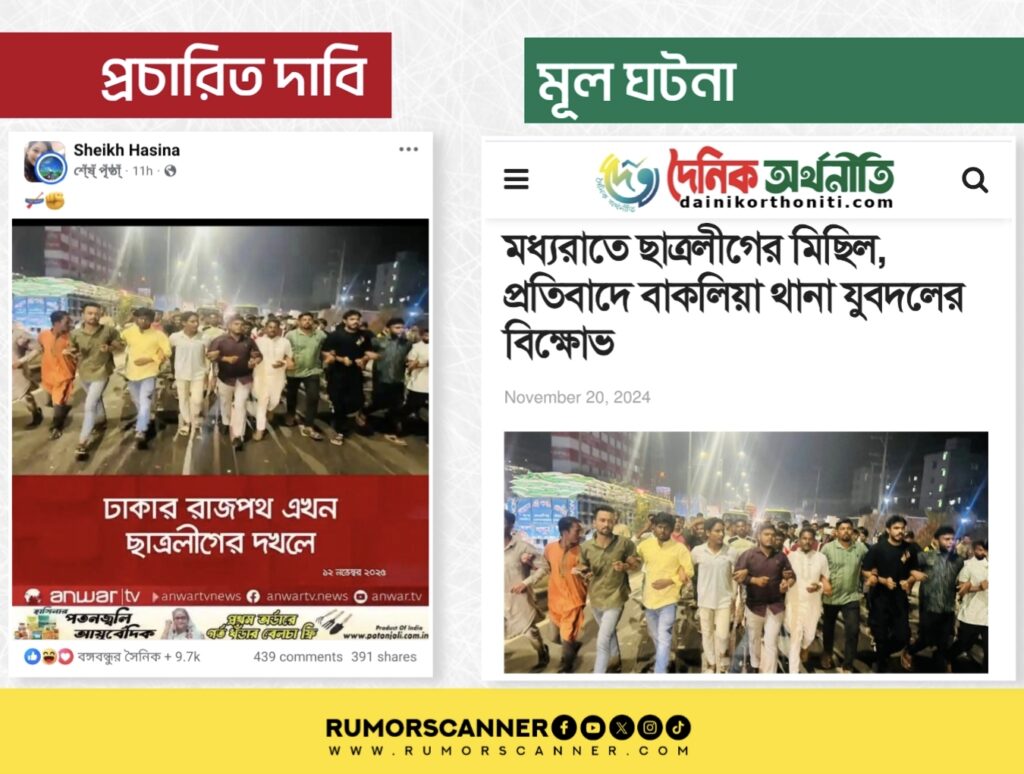 সম্প্রতি, ‘ঢাকার রাজপথ এখন ছাত্রলীগের দখলে’ শীর্ষক তথ্যে বা শিরোনামে মিছিলের একটি ছবি যুক্ত করে একটি ডিজিটাল ব্যানার সামাজিক যোগাযোগমাধ্যমে প্রচার করা হচ্ছে।