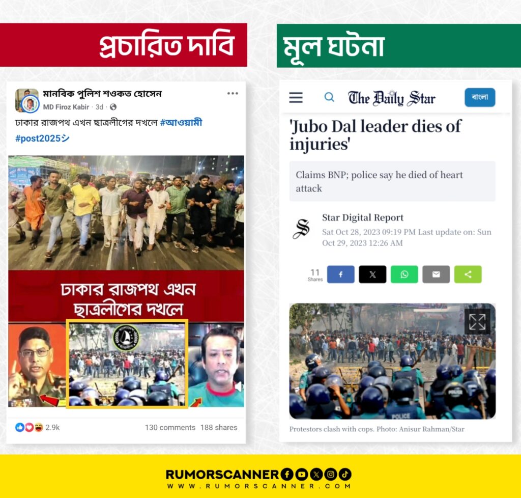 পুলিশের সাথে একদল ব্যক্তির সংঘর্ষের ছবিটির বিষয়ে অনুসন্ধানে ডেইলি স্টারের ওয়েবসাইটে ২০২৩ সালের ২৮ অক্টোবর প্রকাশিত একটি প্রতিবেদন খুঁজে পাওয়া যায়। উক্ত প্রতিবেদনে যুক্ত ছবির সাথে আলোচিত ছবিটির মিল রয়েছে।