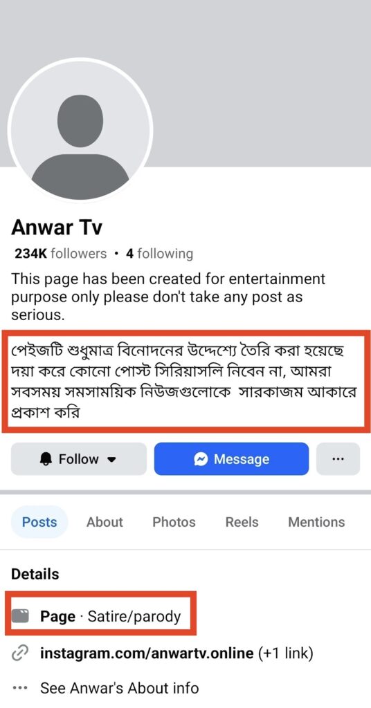 এরপর Anwar Tv নামক ফেসবুক পেজটি পর্যবেক্ষণ করে জানা যায়, এটি একটি স্যাটায়ার বা হাস্যরসাত্মক পেজ। পেজটির বায়োতেও বিষয়টি উল্লেখ রয়েছে।