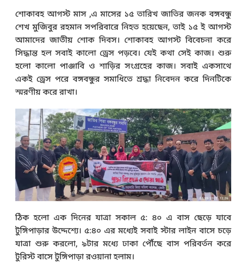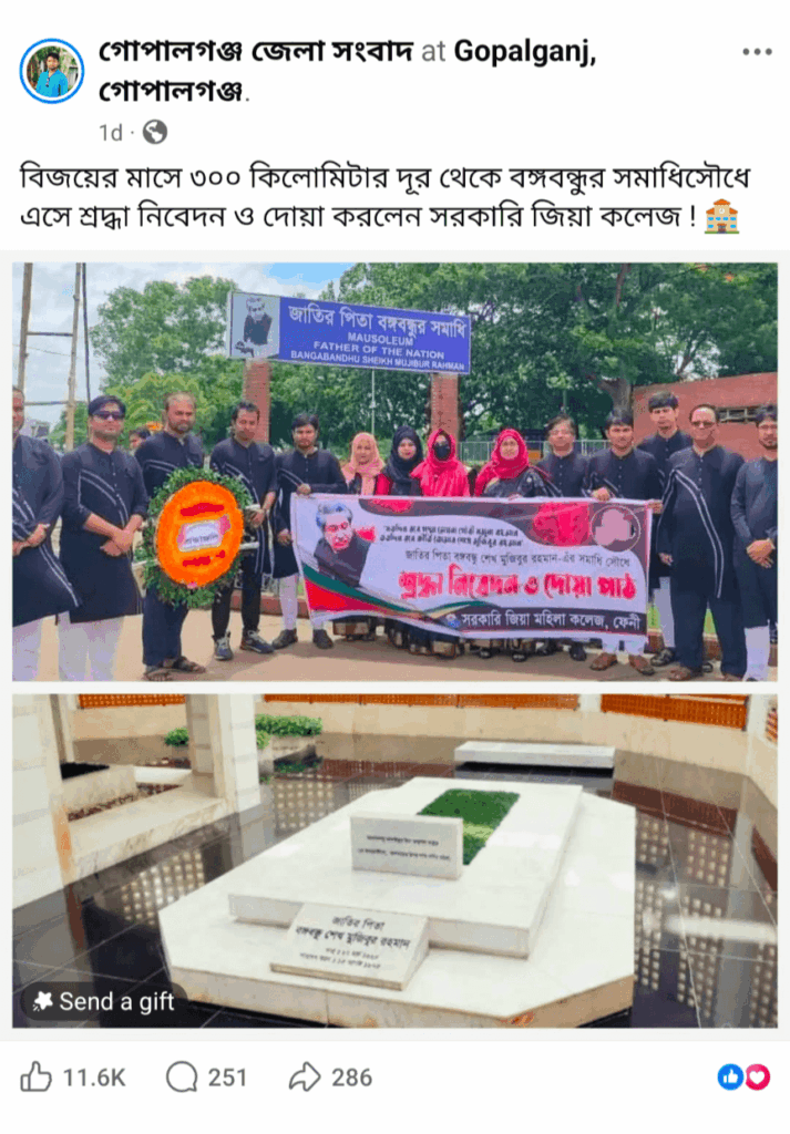 সম্প্রতি, ফেনীর সরকারি জিয়া মহিলা কলেজের পক্ষ থেকে গোপালগঞ্জ জেলার টুঙ্গিপাড়ায় অবস্থিত বঙ্গবন্ধু শেখ মুজিবুর রহমানের সমাধিসৌধে শ্রদ্ধা নিবেদন করা হয়েছে দাবিতে সামাজিক যোগাযোগ মাধ্যম ফেসবুকে একটি ছবি প্রচার করা হয়েছে।