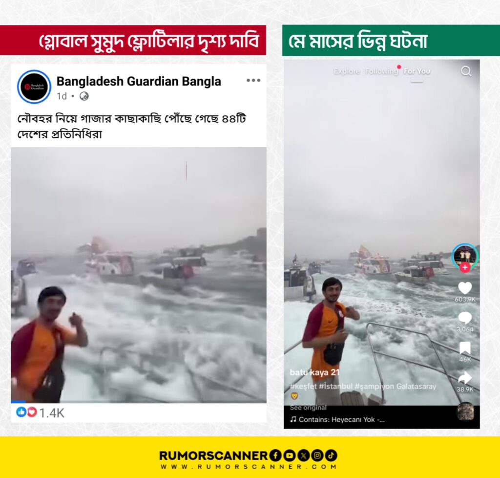 এ বিষয়ে অনুসন্ধানে টিকটকে batu kaya 21 নামের অ্যাকাউন্টে গত ২৬ মে প্রকাশিত একটি ভিডিওর সাথে আলোচিত ভিডিওর মিল পাওয়া যায়। অথচ, গ্লোবাল সুমুদ ফ্লোটিলার যাত্রা শুরুই হয়েছে এর তিন মাস পরে। তাই ভিডিওটি কোনোভাবেই গ্লোবাল সুমুদ ফ্লোটিলার হওয়া সম্ভব নয়। টিকটকের ভিডিওটির ক্যাপশনে keşfet, İstanbul, şampiyon Galatasaray এ জাতীয় শব্দদ্বয়ের হ্যাশট্যাগের ব্যবহার দেখা গেছে। এখানে şampiyon Galatasaray বলতে গ্যালাতাসারে নামের কোনো দলের চ্যাম্পিয়ন হওয়া বোঝাচ্ছে।