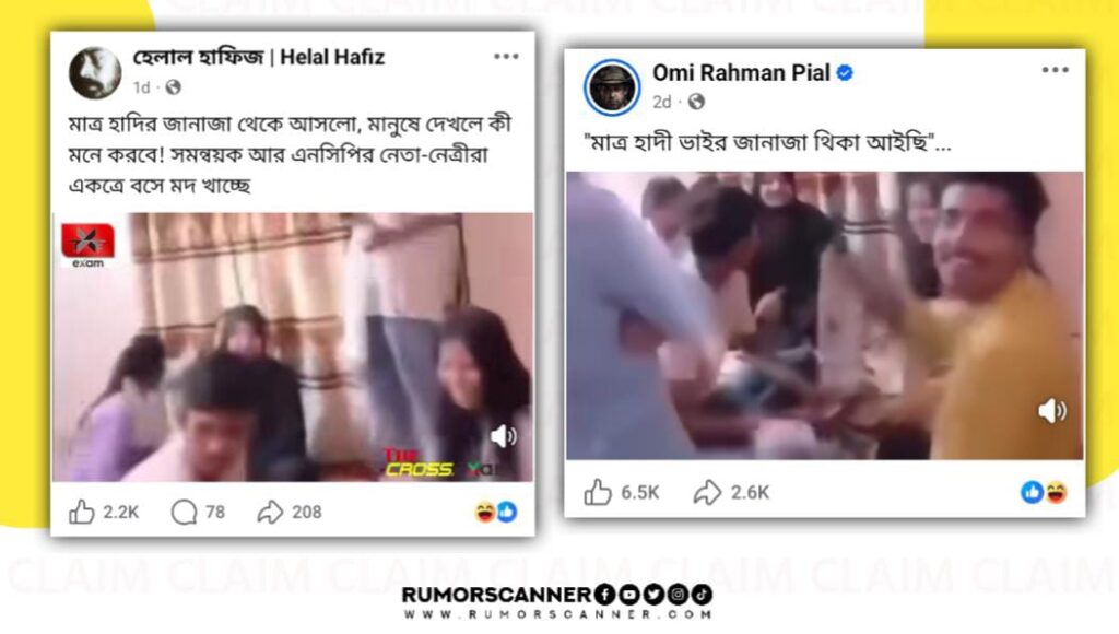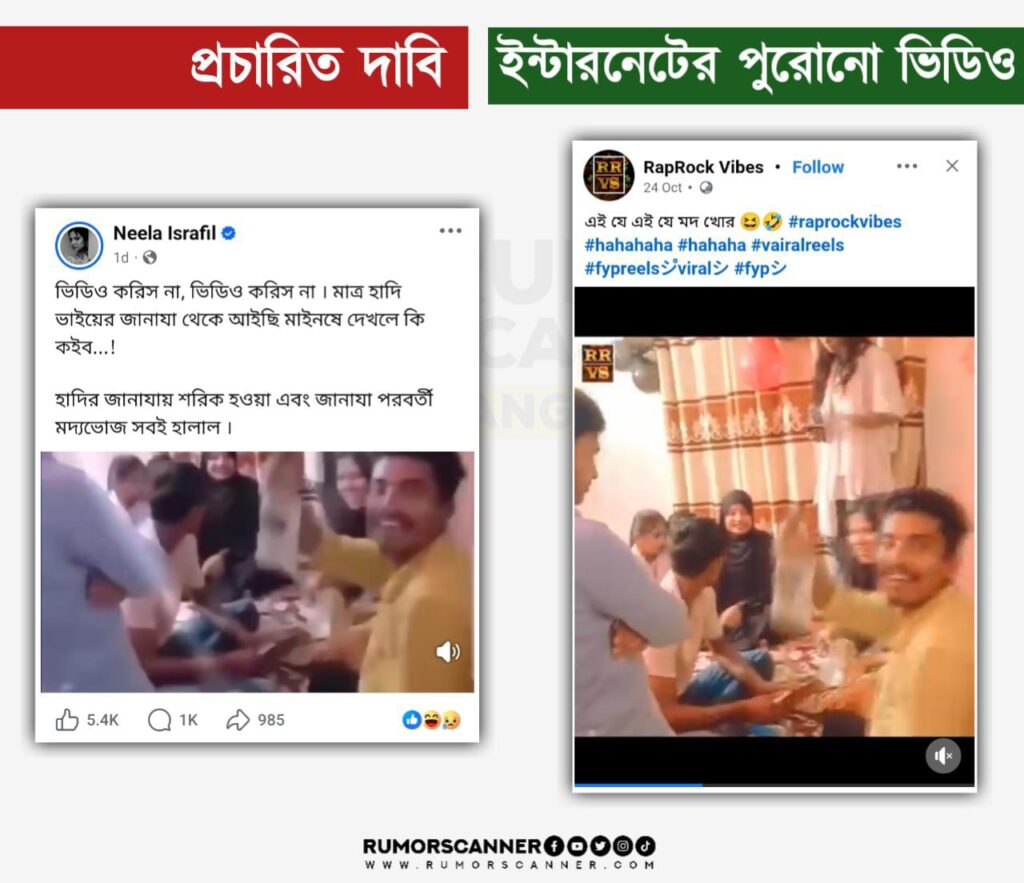রিউমর স্ক্যানার টিমের অনুসন্ধানে জানা যায়, প্রচারিত ভিডিওটি ওসমান হাদির জানাজার পর মদের আসরের দৃশ্যের নয় বরং, ভিডিওটি ওসমান হাদির জানাজার আগে থেকে অন্তত গত অক্টোবর থেকেই অনলাইনে বিদ্যমান।
