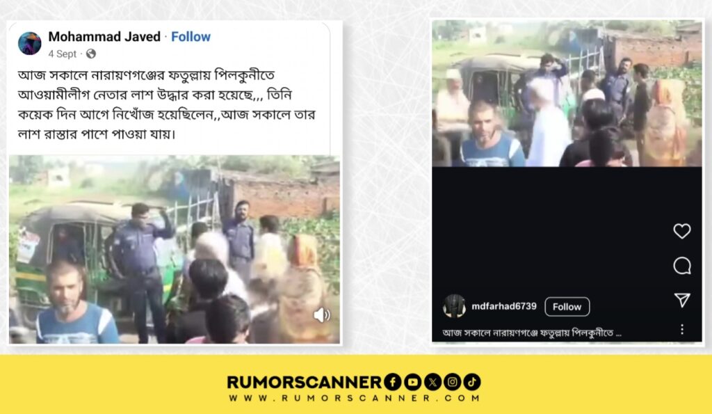 গত ০৪ সেপ্টেম্বর সকালে নারায়ণগঞ্জের ফতুল্লায় পিলকুনীতে আওয়ামীলীগ নেতার লাশ উদ্ধার করা হয়েছে দাবিতে একটি ভিডিও সামাজিক যোগাযোগমাধ্যমে ছড়িয়ে পড়েছে।