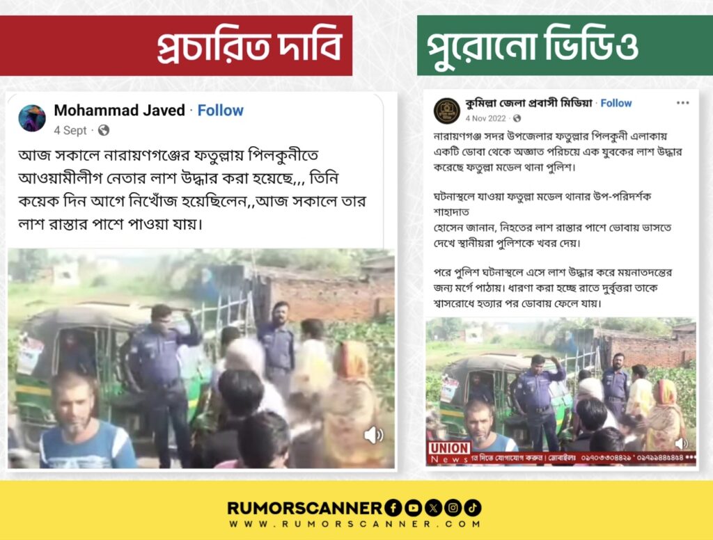 সুতরাং, ২০২২ সালের নভেম্বর মাসে নারায়ণগঞ্জের ফতুল্লার পিলকুনী এলাকা অজ্ঞাতনামা যুবকের লাশ পাওয়ার দৃশ্যকে গত সেপ্টেম্বর মাসে একই স্থান থেকে আওয়ামী লীগ নেতার লাশ উদ্ধারের দৃশ্য দাবিতে প্রচার করা হচ্ছে; যা সম্পূর্ণ মিথ্যা।