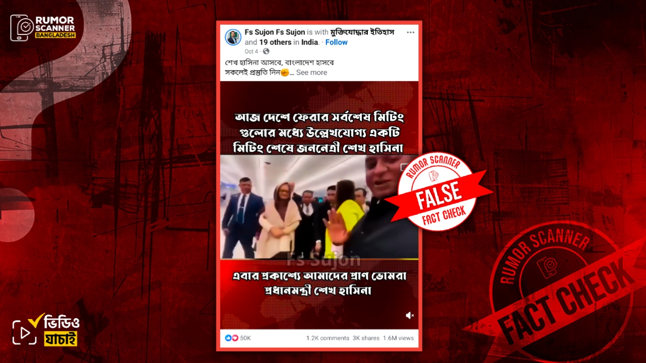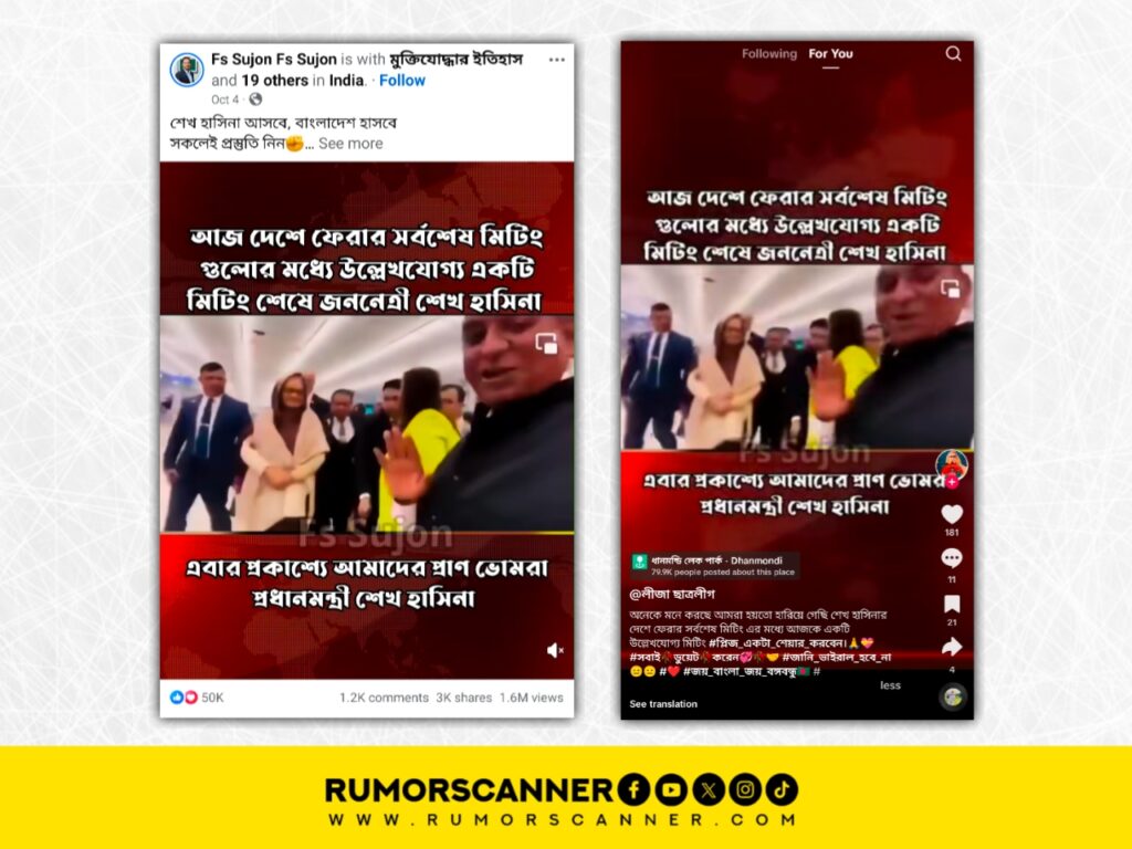 গত বছরের ৫ আগস্ট ছাত্র-জনতার অভ্যুত্থানের মাধ্যমে ক্ষমতাচ্যুত হয় তৎকালীন আওয়ামী লীগ সরকার। সেদিনই পাশ্বর্বর্তী রাষ্ট্র ভারতে আশ্রয় নেন দেশের সাবেক প্রধানমন্ত্রী ও বাংলাদেশ আওয়ামী লীগের সভানেত্রী শেখ হাসিনা। এরপর তাকে আর প্রকাশ্যে দেখা যায়নি। কিন্তু শেখ হাসিনার দেশে প্রত্যাবর্তনের বিষয়ে গত ৪ অক্টোবর বিশেষ মিটিং অনুষ্ঠিত হয়েছে এবং সেদিন শেখ হাসিনা প্রকাশ্যে এসেছেন দাবিতে সামাজিক যোগাযোগ মাধ্যমে একটি ভিডিও প্রচার করা হয়। ভিডিওতে দেখা যাচ্ছে, একজন ব্যক্তি সেলফি ভিডিও ধারণ করছেন যেখানে শেখ হাসিনাকে লোকসমাগম থেকে বের হতে দেখা যাচ্ছে।