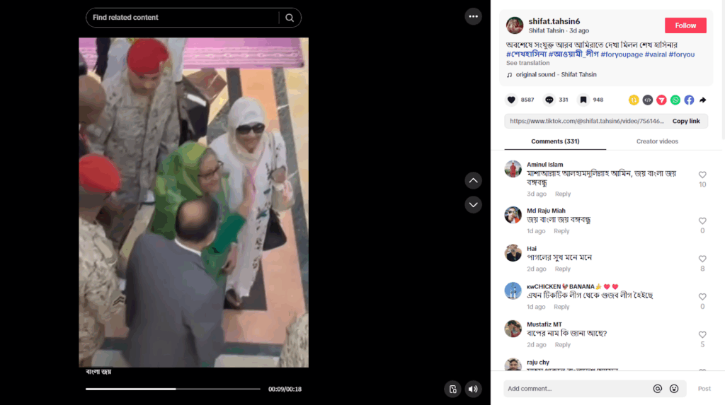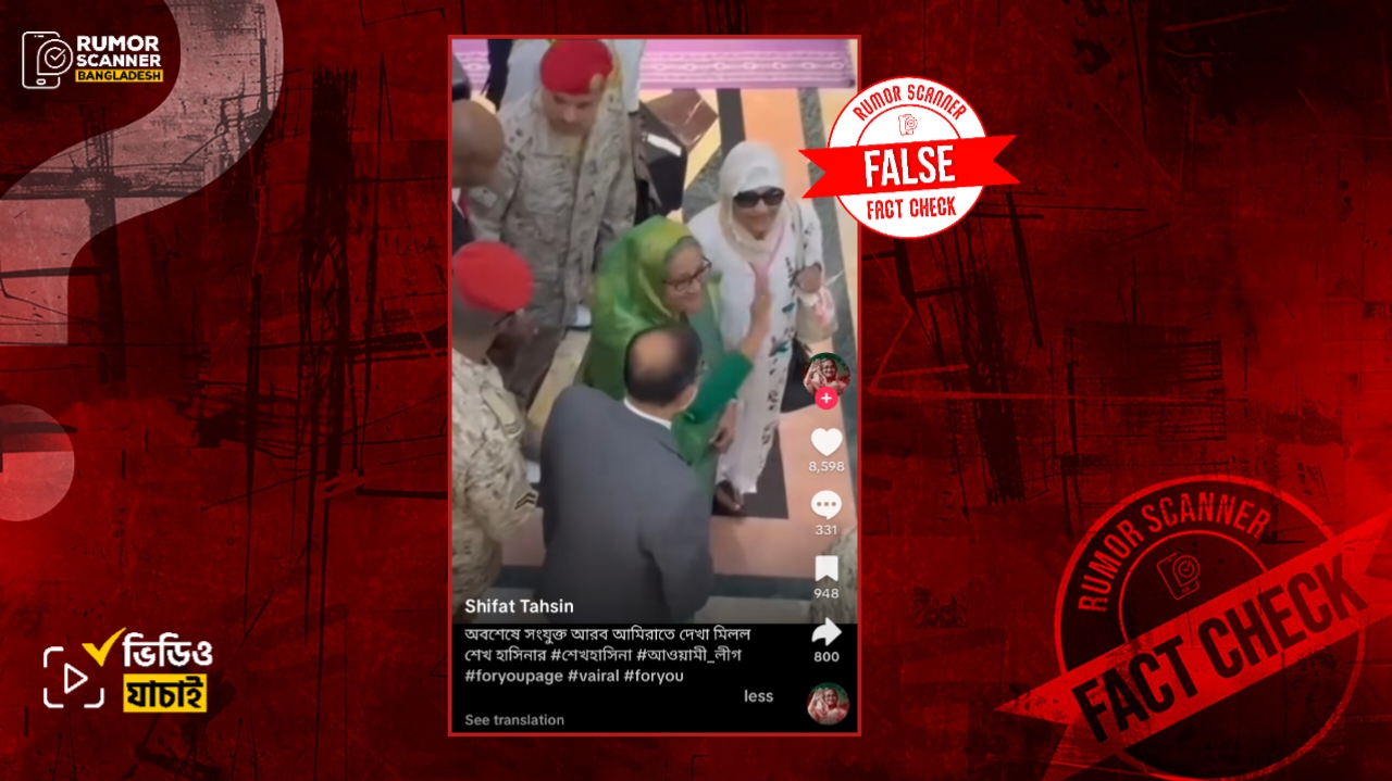 সম্প্রতি, “অবশেষে সংযুক্ত আরব আমিরাতে দেখা মিলল শেখ হাসিনার” শিরোনামে একটি ভিডিও সামাজিক যোগাযোগ মাধ্যমে প্রচার করা হয়েছে।