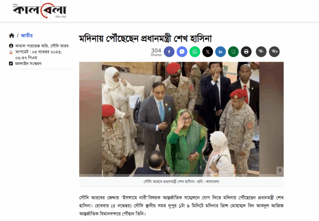 প্রতিবেদনটির বিস্তারিত বিবরণী থেকে জানা যায়, সৌদি আরবের জেদ্দায় ‘ইসলামে নারী’ বিষয়ক আন্তর্জাতিক সম্মেলনে যোগ দিতে ২০২৩ সালের নভেম্বর মাসে মদিনায় যান শেখ হাসিনা। সম্মেলন শেষে মক্কায় ওমরাহ পালন করে ঐ বছরের ০৮ নভেম্বর ঢাকায় ফেরেন তিনি।
