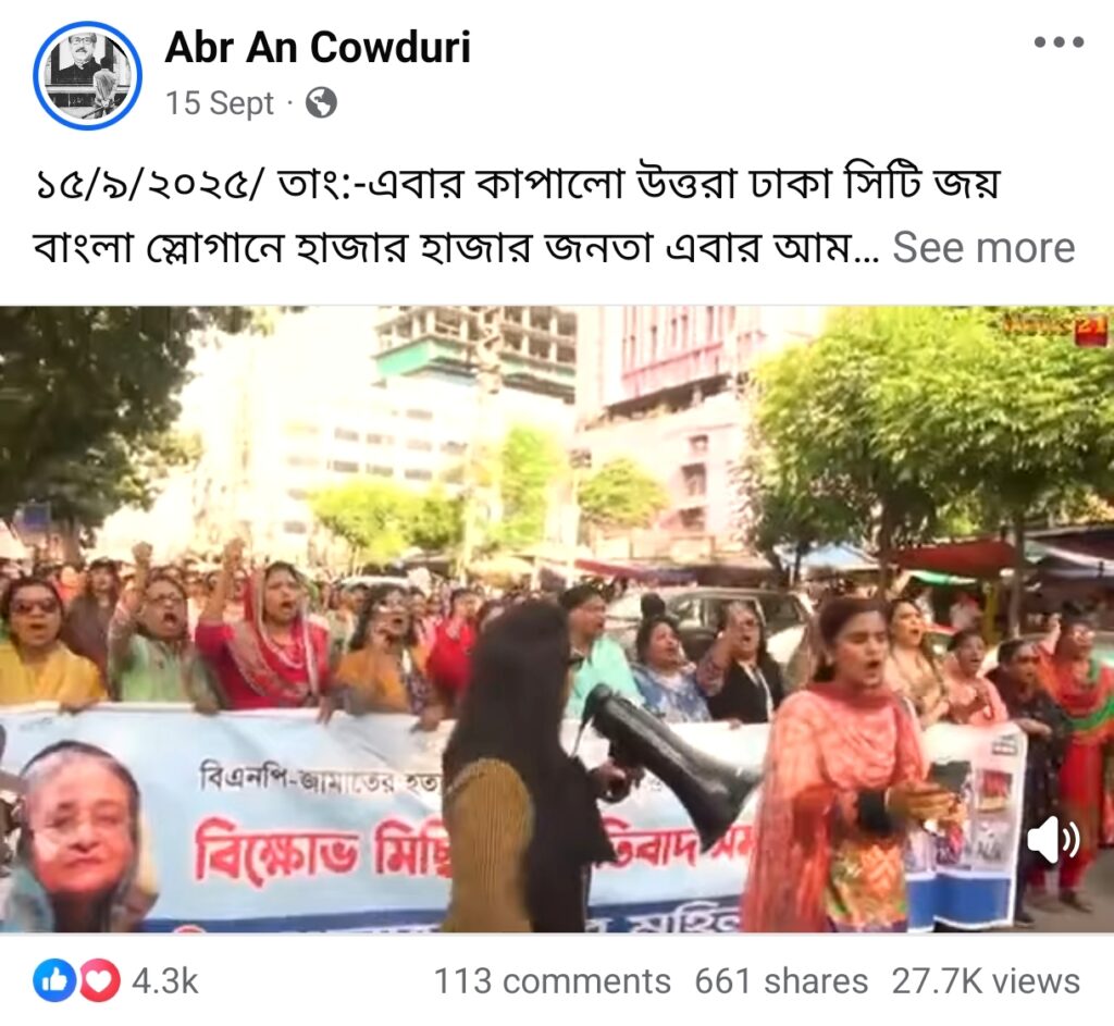 সম্প্রতি, ‘১৫/৯/২০২৫/ তাং:-এবার কাপালো উত্তরা ঢাকা সিটি জয় বাংলা স্লোগানে হাজার হাজার জনতা এবার আমাদেরকে সামলাতে পারবেন তো জয় বাংলা জয় বঙ্গবন্ধু’ শীর্ষক ক্যাপশনে একটি ভিডিও সামাজিক যোগাযোগমাধ্যমে ছড়িয়ে পড়েছে।