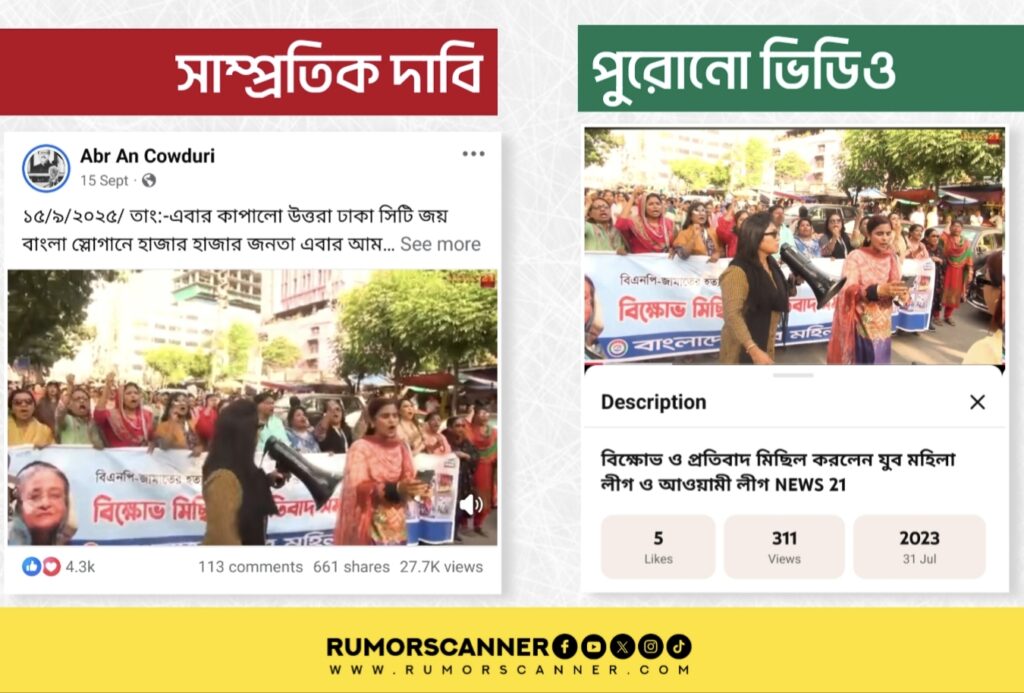 রিউমর স্ক্যানার টিমের অনুসন্ধানে জানা যায়, প্রচারিত ভিডিওটি সাম্প্রতিক সময়ে আওয়ামী লীগের নেতাকর্মীদের বিক্ষোভ মিছিলের নয় বরং ২০২৩ সালে দলটির বিভিন্ন অঙ্গসংগঠনের নেতাকর্মীদের বিক্ষোভ মিছিলের দৃশ্যকে সাম্প্রতিক ঘটনা দাবিতে প্রচার করা হয়েছে।