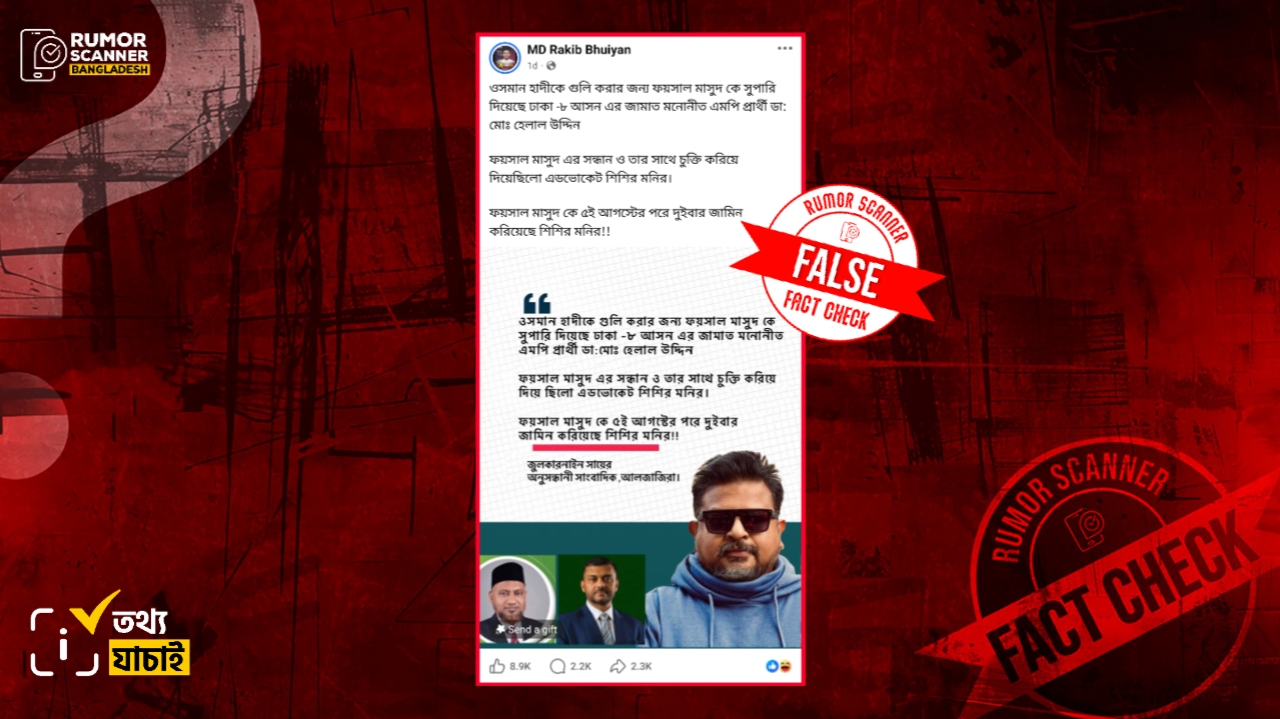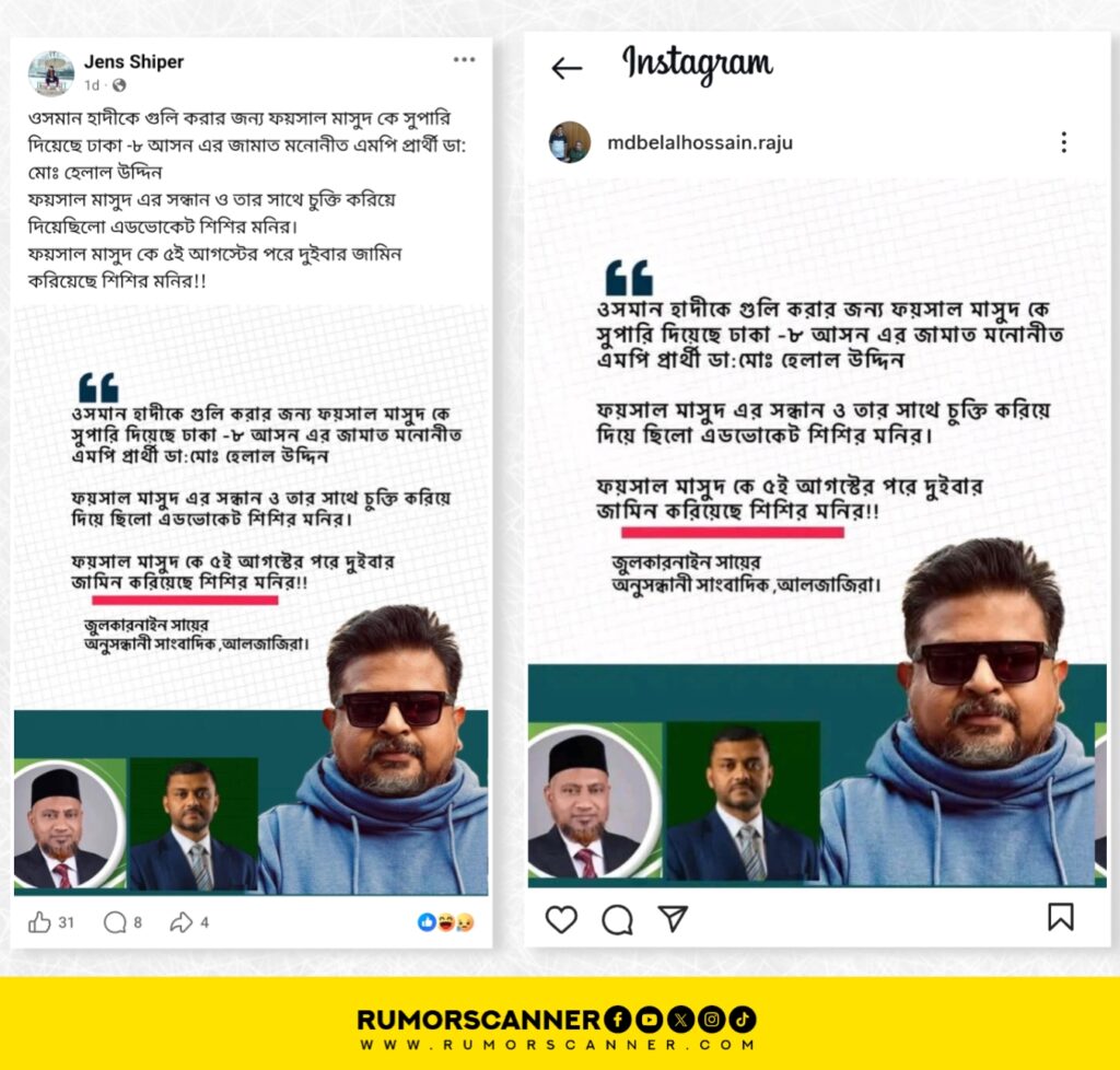 সম্প্রতি, প্রবাসী সাংবাদিক জুলকারনাইন সায়ের ‘ওসমান হাদীকে গুলি করার জন্য ফয়সাল মাসুদকে সুপারি দিয়েছে ঢাকা -৮ আসন এর জামাত মনোনীত এমপি প্রার্থী ডা: মোঃ হেলাল উদ্দিন। ফয়সাল মাসুদ এর সন্ধান ও তার সাথে চুক্তি করিয়ে দিয়ে ছিলো এডভোকেট শিশির মনির। ফয়সাল মাসুদকে ৫ই আগস্টের পরে দুইবার জামিন করিয়েছে শিশির মনির’ শীর্ষক মন্তব্য করেছেন দাবিতে একটি তথ্য সামাজিক যোগাযোগ মাধ্যমে ছড়িছে পড়েছে।