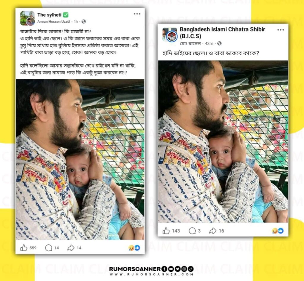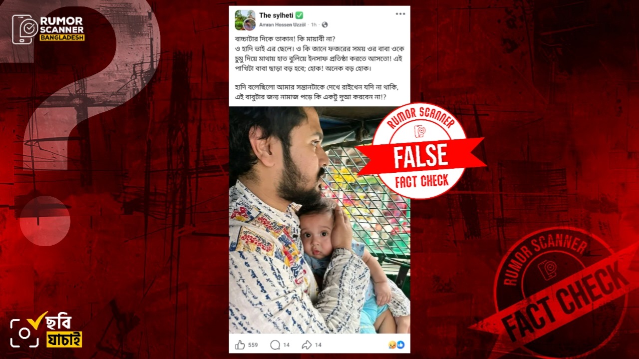 গত ১২ ডিসেম্বর দুপুরে ঢাকার পুরানা পল্টনের বক্স কালভার্ট রোডে ইনকিলাব মঞ্চের মুখপাত্র শরিফ ওসমান হাদি গুলিবিদ্ধ হন। এরপর সিঙ্গাপুরে চিকিৎসাধীন অবস্থায় গত ১৮ ডিসেম্বর তিনি মারা যান। এই ঘটনার পর অনলাইনে একজন ব্যক্তির সাথে এক শিশুর ছবি প্রচার করে দাবি করা হচ্ছে, শিশুটি হাদির সন্তান।