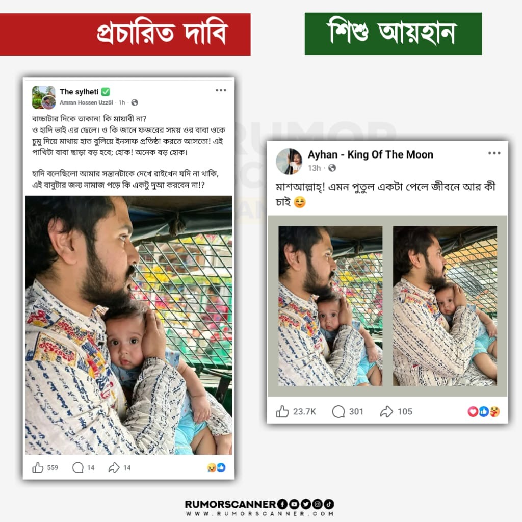 রিউমর স্ক্যানার টিমের অনুসন্ধানে জানা যায়, প্রচারিত ছবিটি ওসমান হাদির সন্তানের ছবি নয়। প্রকৃতপক্ষে অন্তর মাশঊদ ও সাদিয়া খান দম্পতির সন্তান আয়হানের ছবি আলোচিত দাবিতে প্রচার করা হয়েছে।